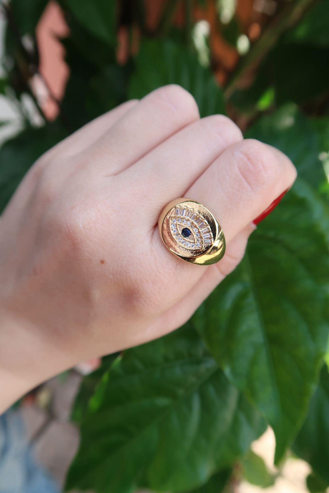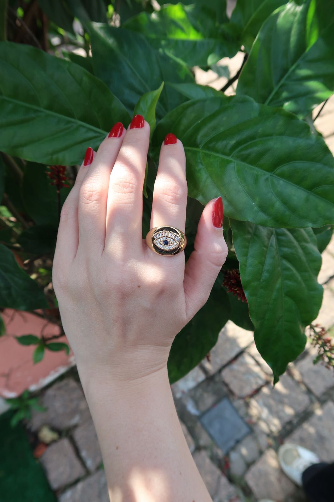 Este anel ajustável traz o símbolo do olho grego cravejado em zircônias, unindo brilho, significado e modernidade. Com tamanho único e sistema ajustável, ele se adapta com conforto a qualquer dedo, ideal para quem busca praticidade sem abrir mão de um visual marcante. Uma peça maximalista, moderna e versátil para compor produções cheias de personalidade.