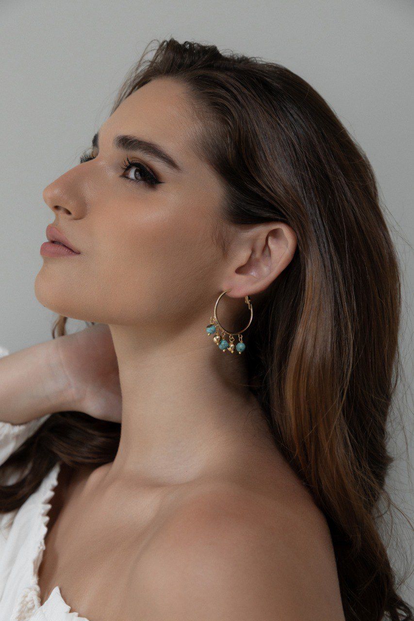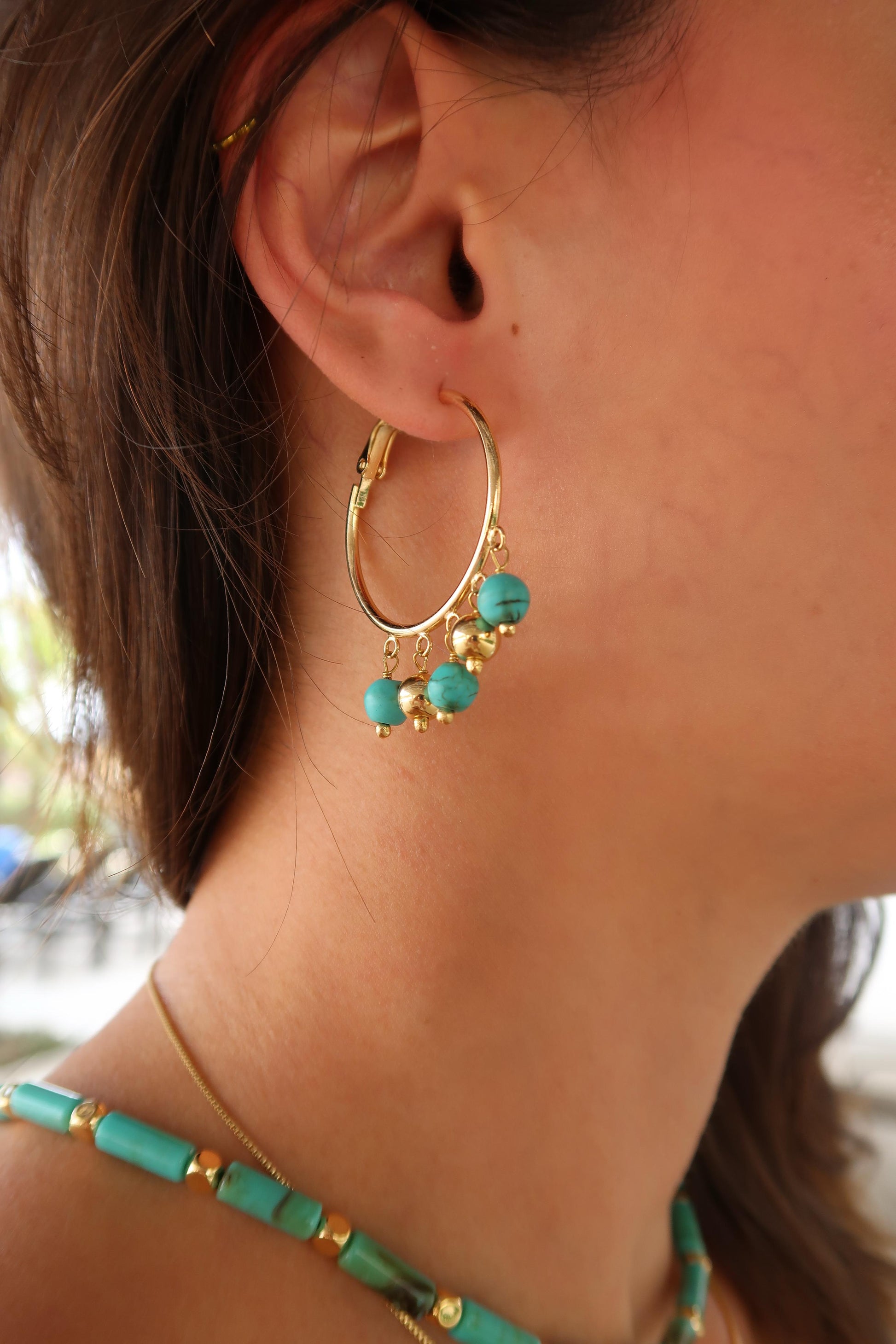 Leve, confortável e cheia de estilo, esta argola fina combina o brilho sofisticado do banho de ouro com a vibrante elegância das pequenas pedras em turquesa. Um acessório jovem e descolado, perfeito para quem ama peças modernas e autênticas. As turquesas estão super em alta, trazendo um toque de cor e frescor para qualquer look.