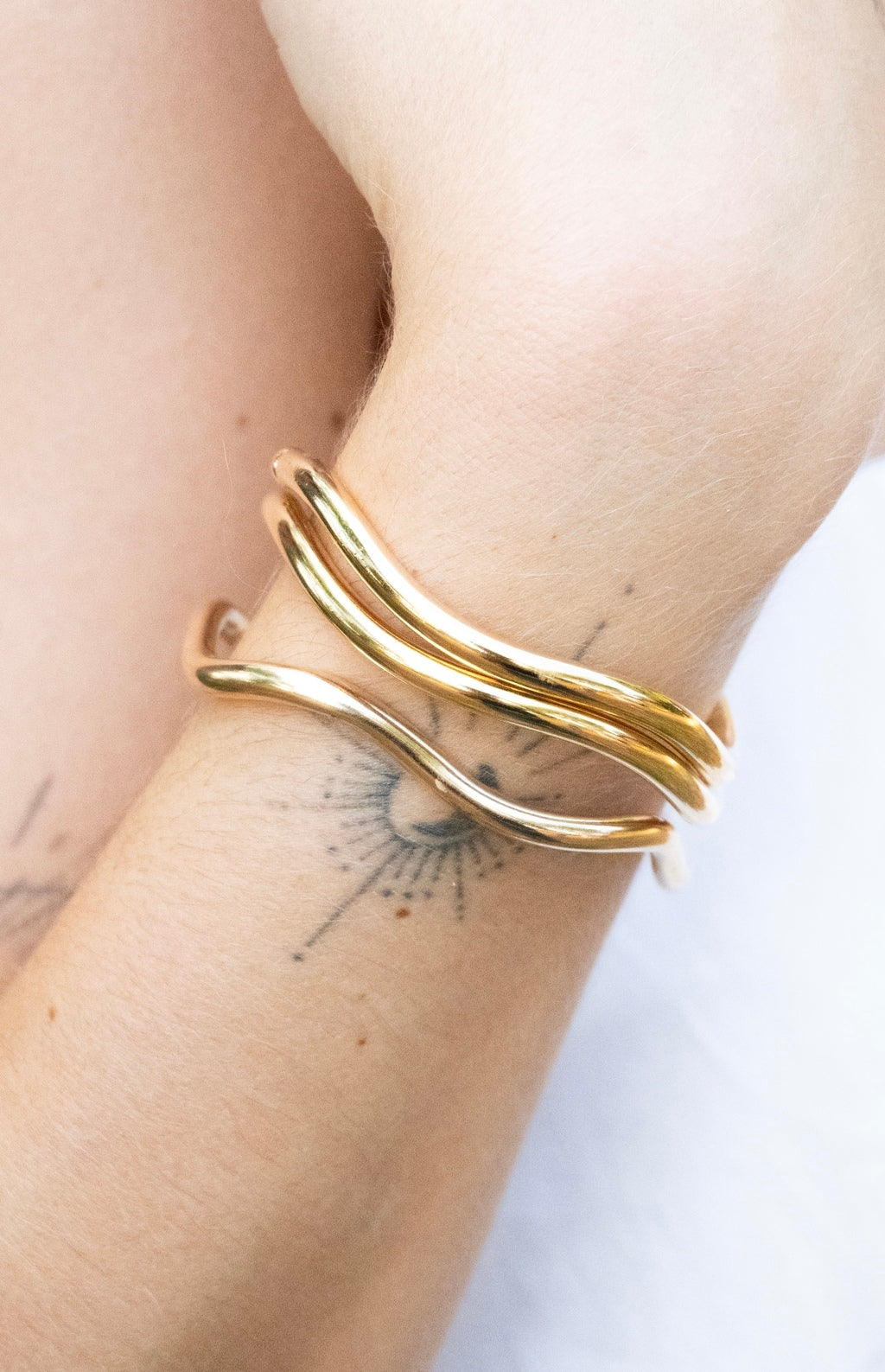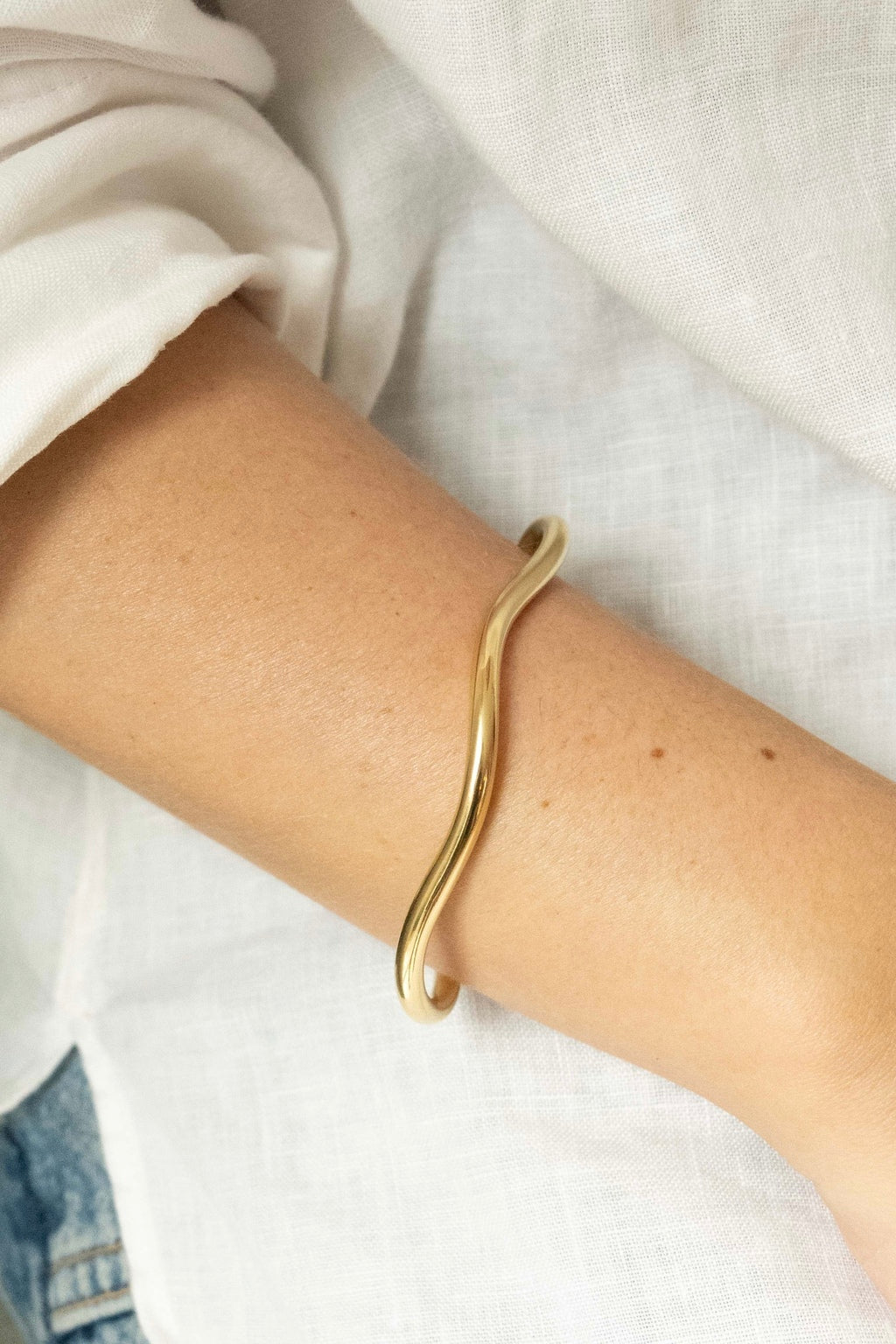 Bracelete em aro ondulado, ajustável e banhado a ouro 18k. Peça vendida individualmente. Uma peça que combina o design orgânico com um toque moderno. Versátil e elegante, este bracelete é uma adição encantadora ao seu visual.