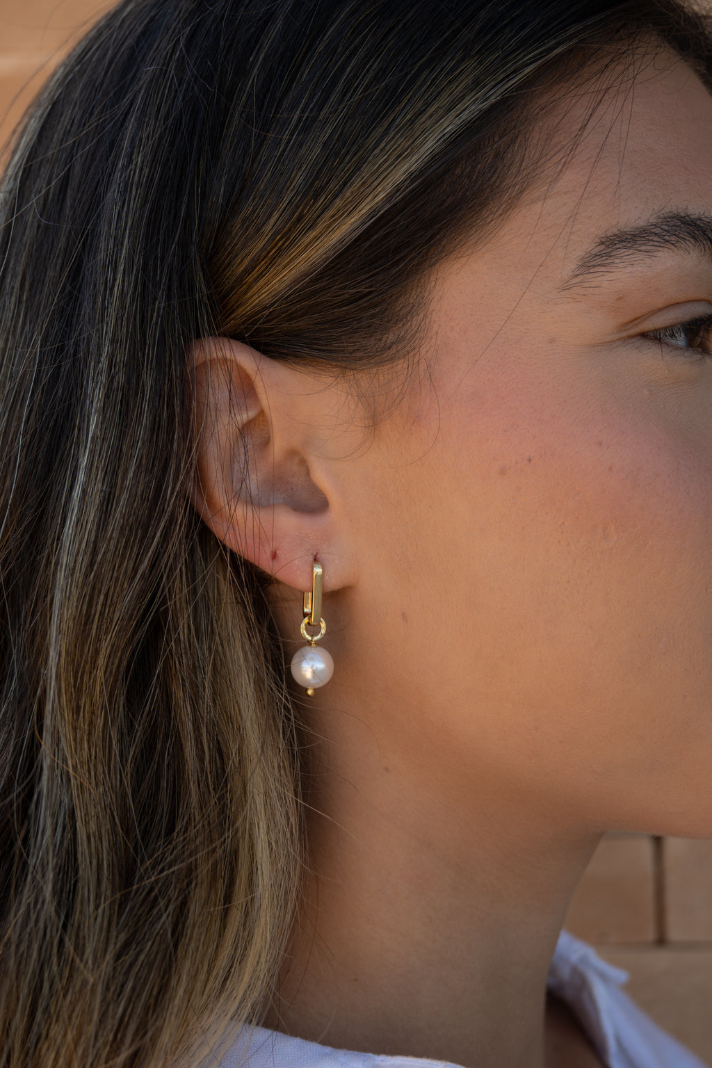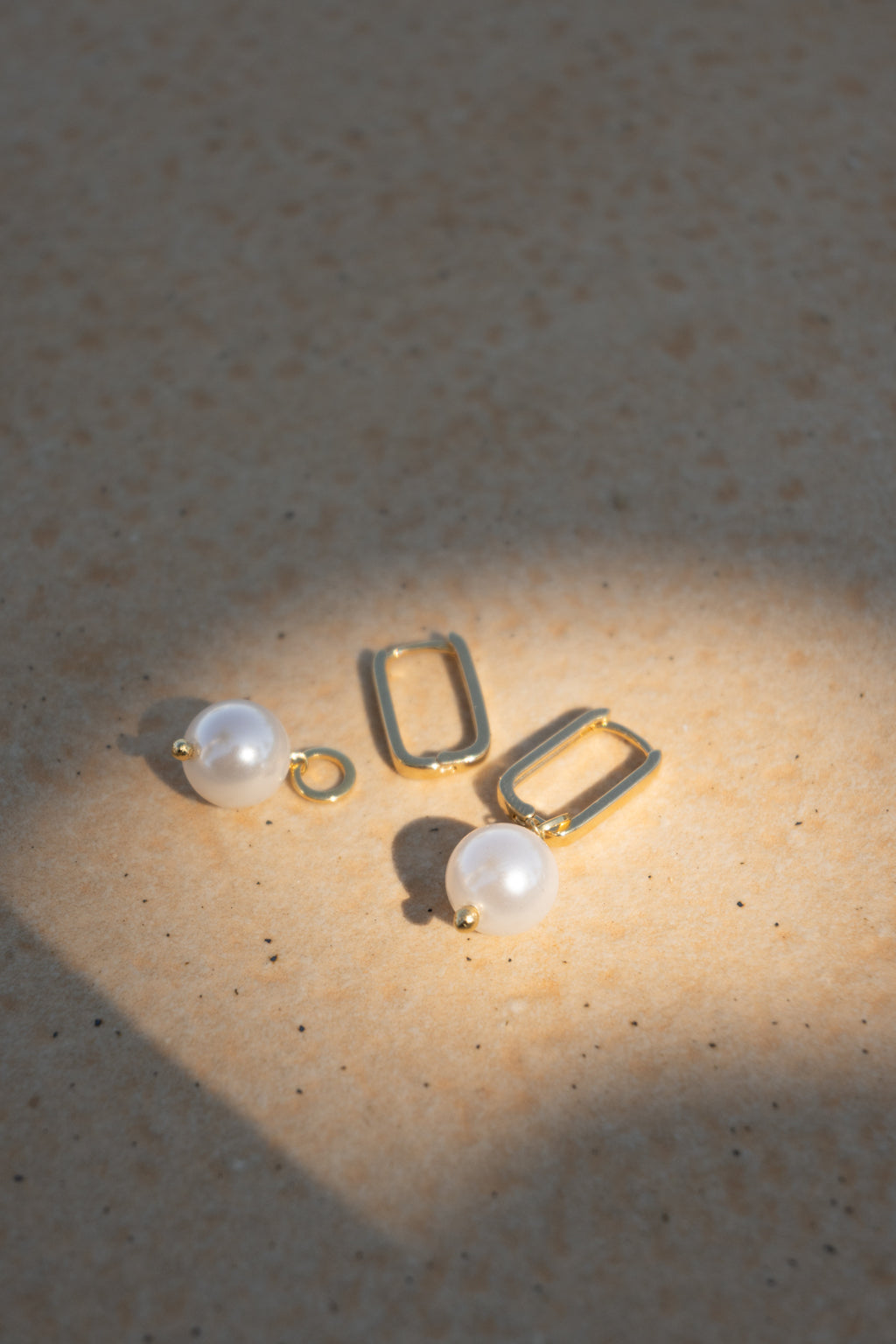 Brinco de argola retangular com pingente removível de pérola de água doce. Uma peça delicada e moderna, perfeita para quem gosta de um toque sofisticado e descontraído. Pode ser usado sozinho para um look minimalista ou combinado com um segundo brinco para um visual mais elaborado. As pérolas, tendência forte para o verão, trazem elegância atemporal à peça, tornando-a uma excelente escolha para presentear alguém especial.