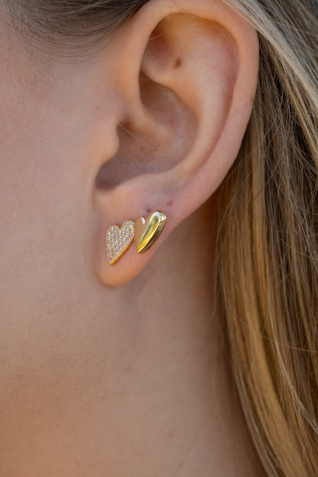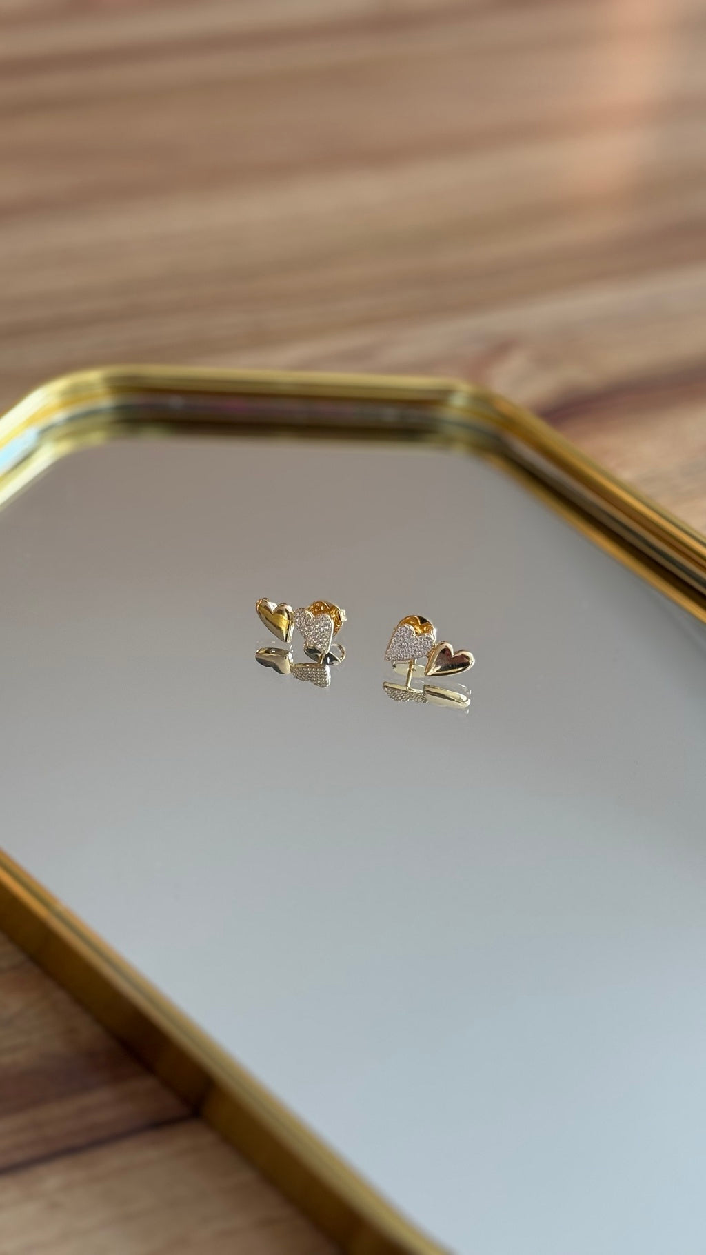 Brinco delicado e minimalista em formato de dois corações, sendo um deles cravejado em zircônias. Uma peça charmosa e sofisticada, fácil e prática de combinar, ideal para quem busca um estilo mais minimalista ou para presentear alguém especial. Perfeito para o dia a dia, traz um toque sutil de elegância a qualquer look.