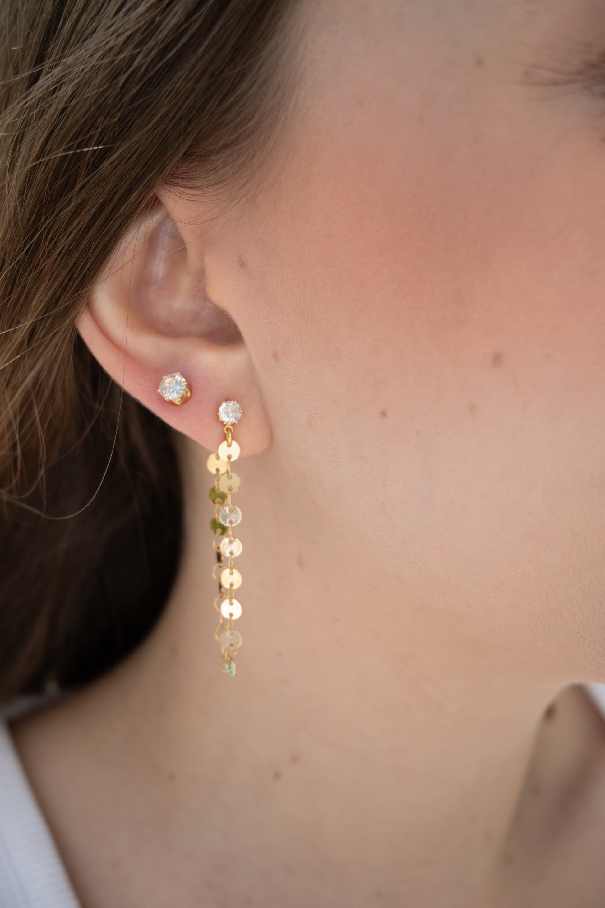Brinco ponto de luz com corrente. A corrente é super leve e delicada, composta por pequenas medalhas que trazem um brilho único, além de adicionar movimento e um charme extra à peça. Um brinco moderno, elegante e perfeito para iluminar qualquer look.