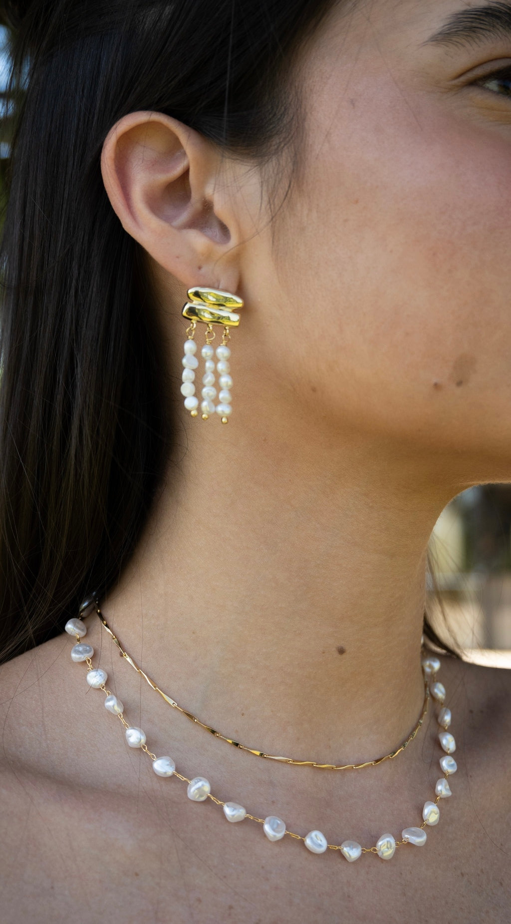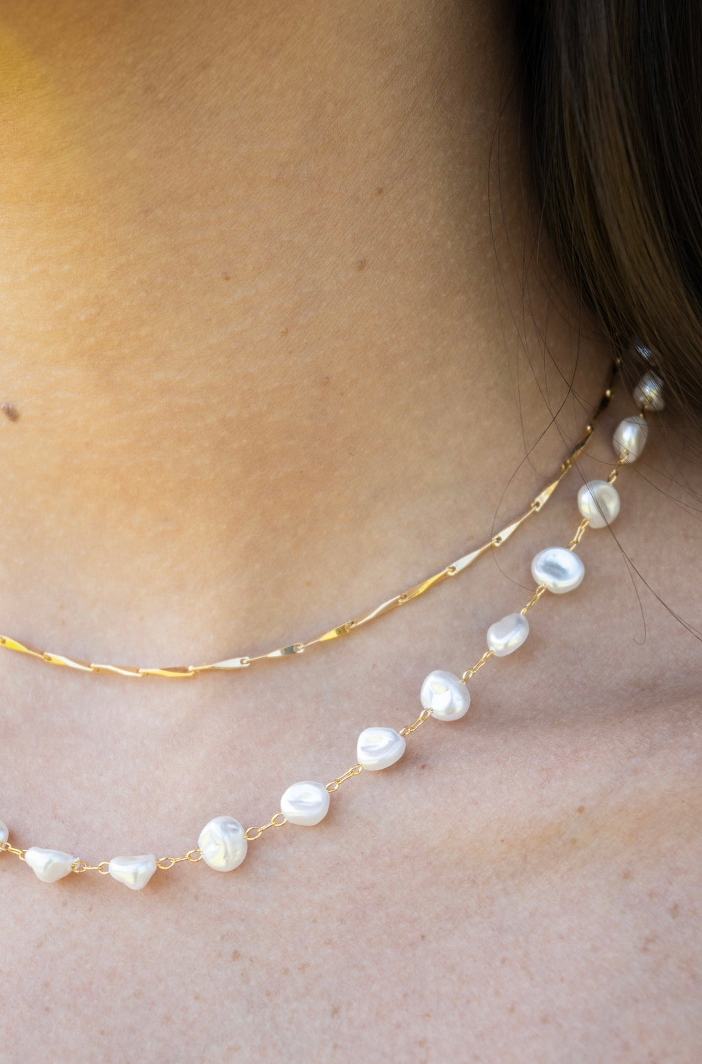 Apresentamos a Choker Mare, uma deslumbrante choker adornada com delicadas pérolas artificiais e corrente banhada a ouro 18k. Esta peça é verdadeiramente uma jóia versátil, podendo ser usada como choker ou colar, graças ao seu extensor ajustável.