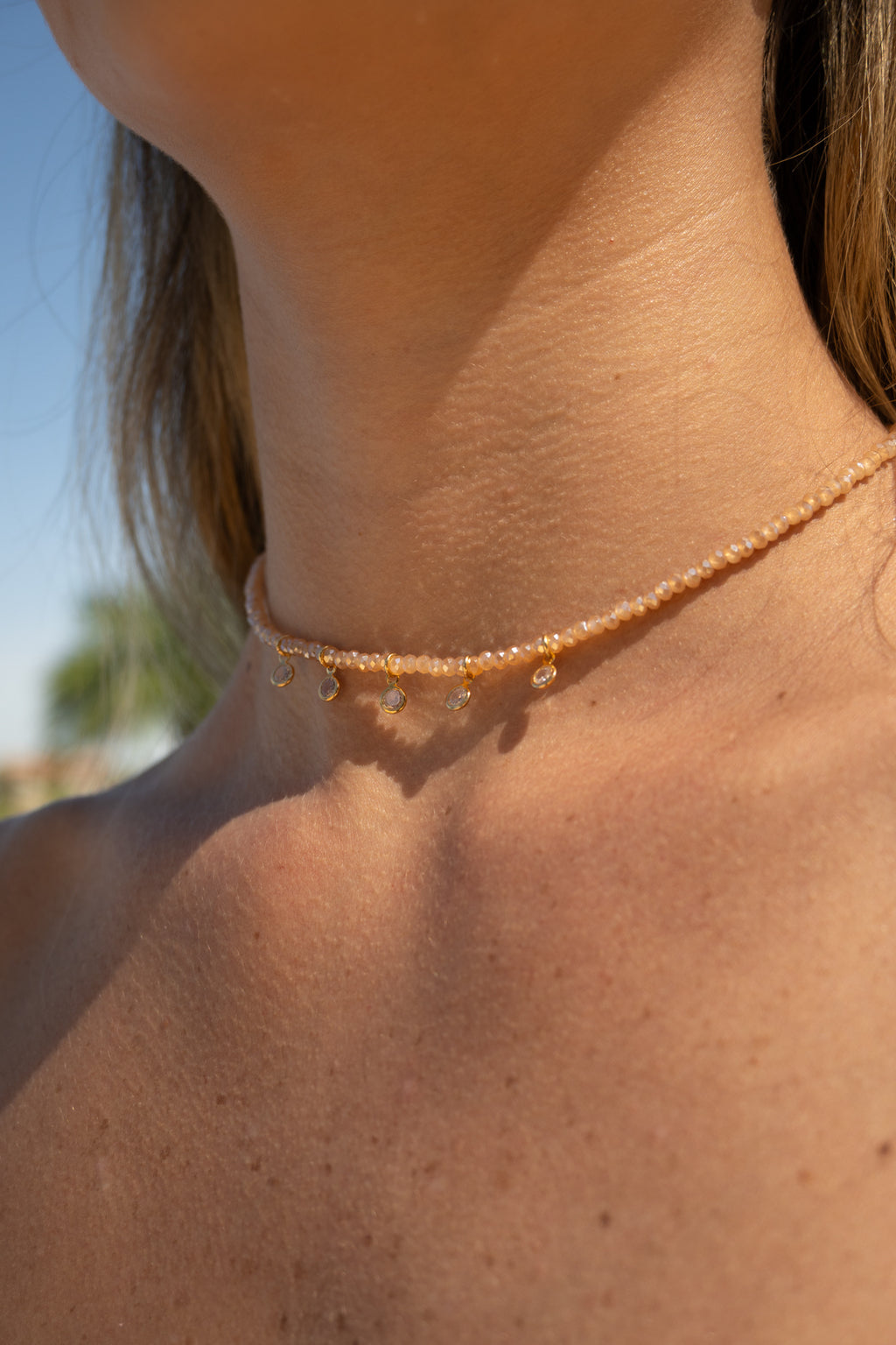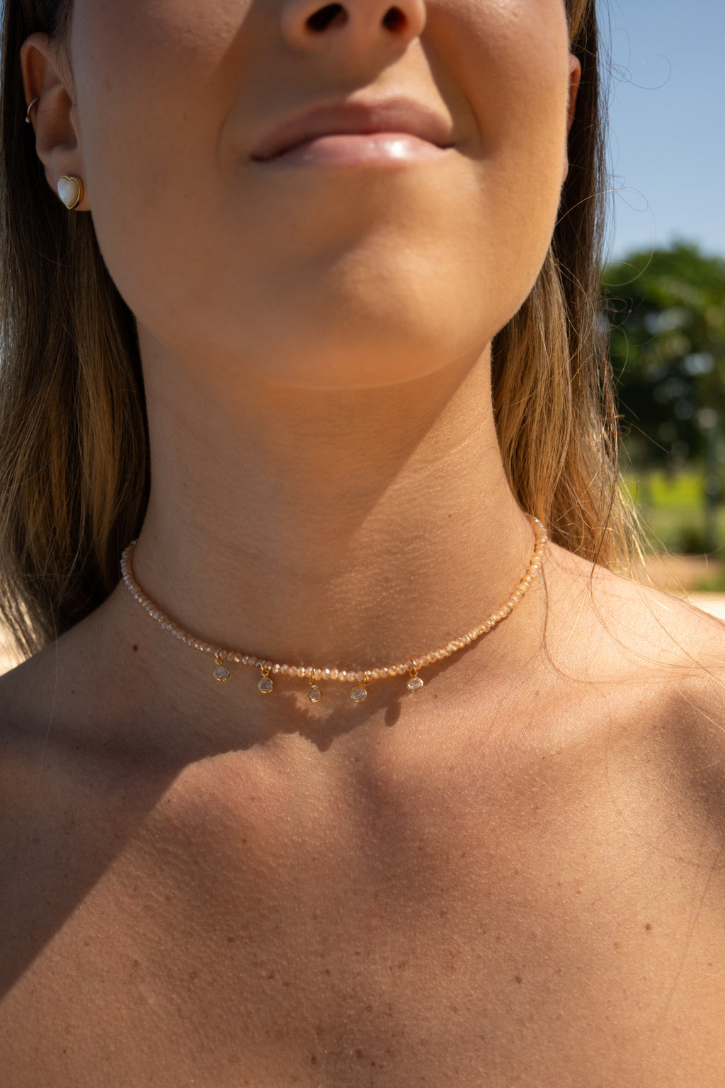 Colar de cristais naturais em tons neutros, adornado com delicados pingentes de zircônias que acrescentam um brilho sutil e sofisticado. Uma peça versátil e elegante, ideal para compor mixes de colares ou para uso solo, trazendo um toque especial a qualquer visual.