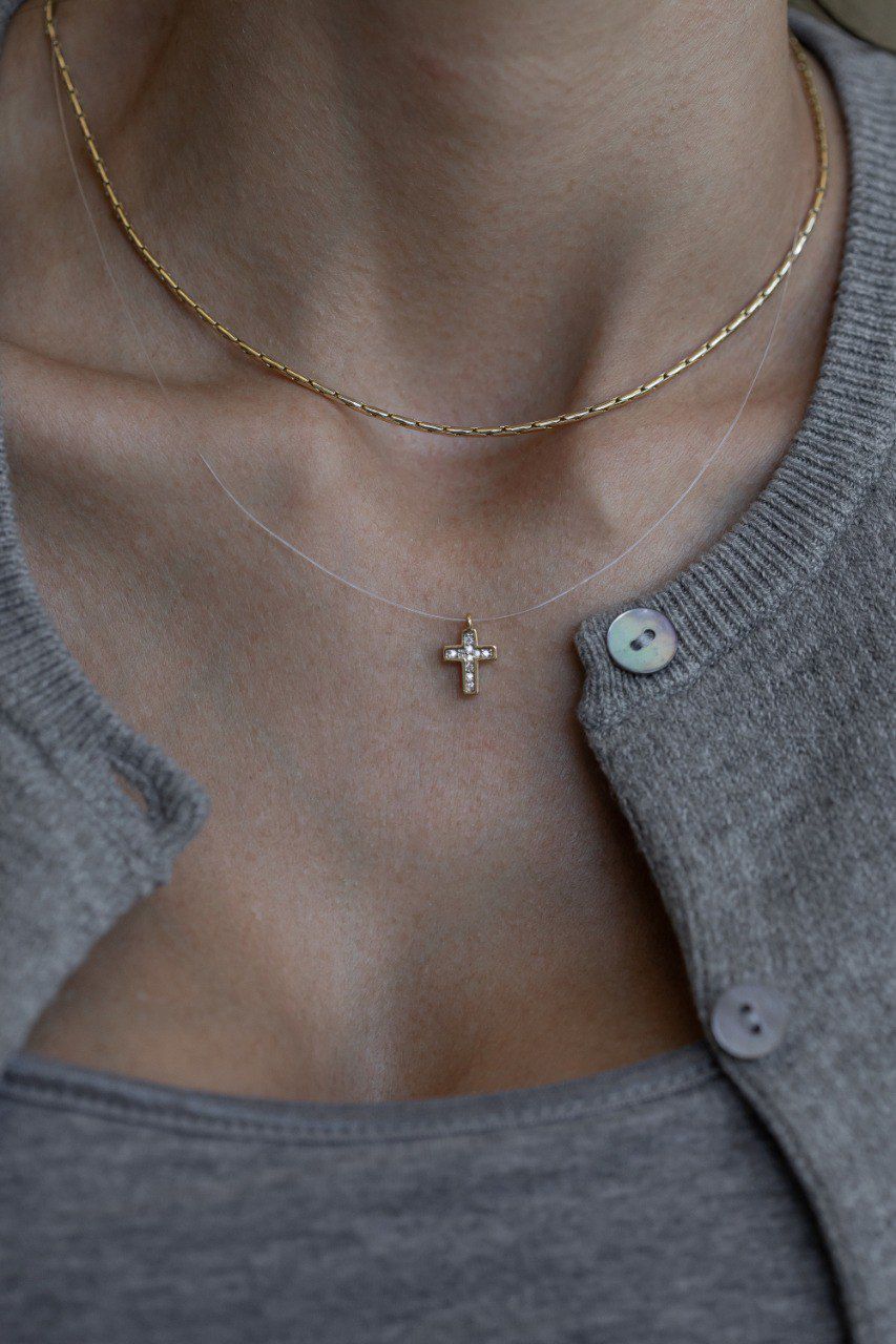 Colar delicado e moderno, confeccionado em fio de nylon transparente, que garante um efeito leve e quase invisível, destacando ainda mais o pingente de cruz cravejado em zircônias.