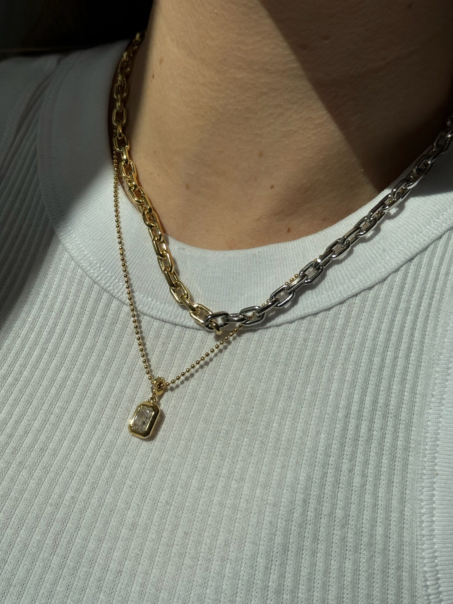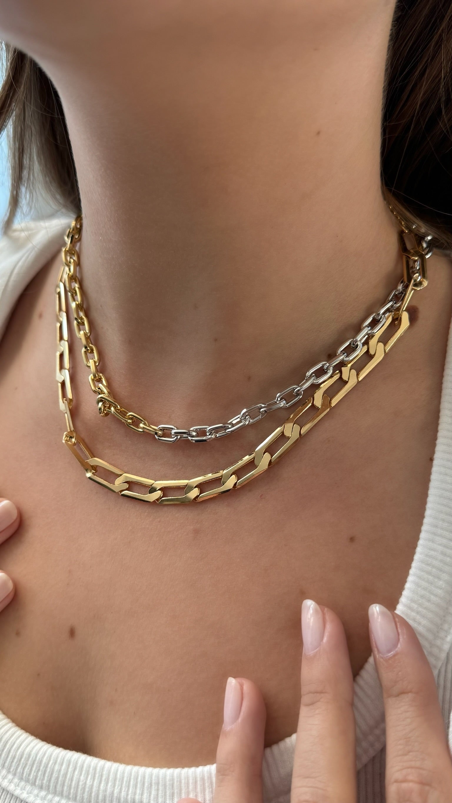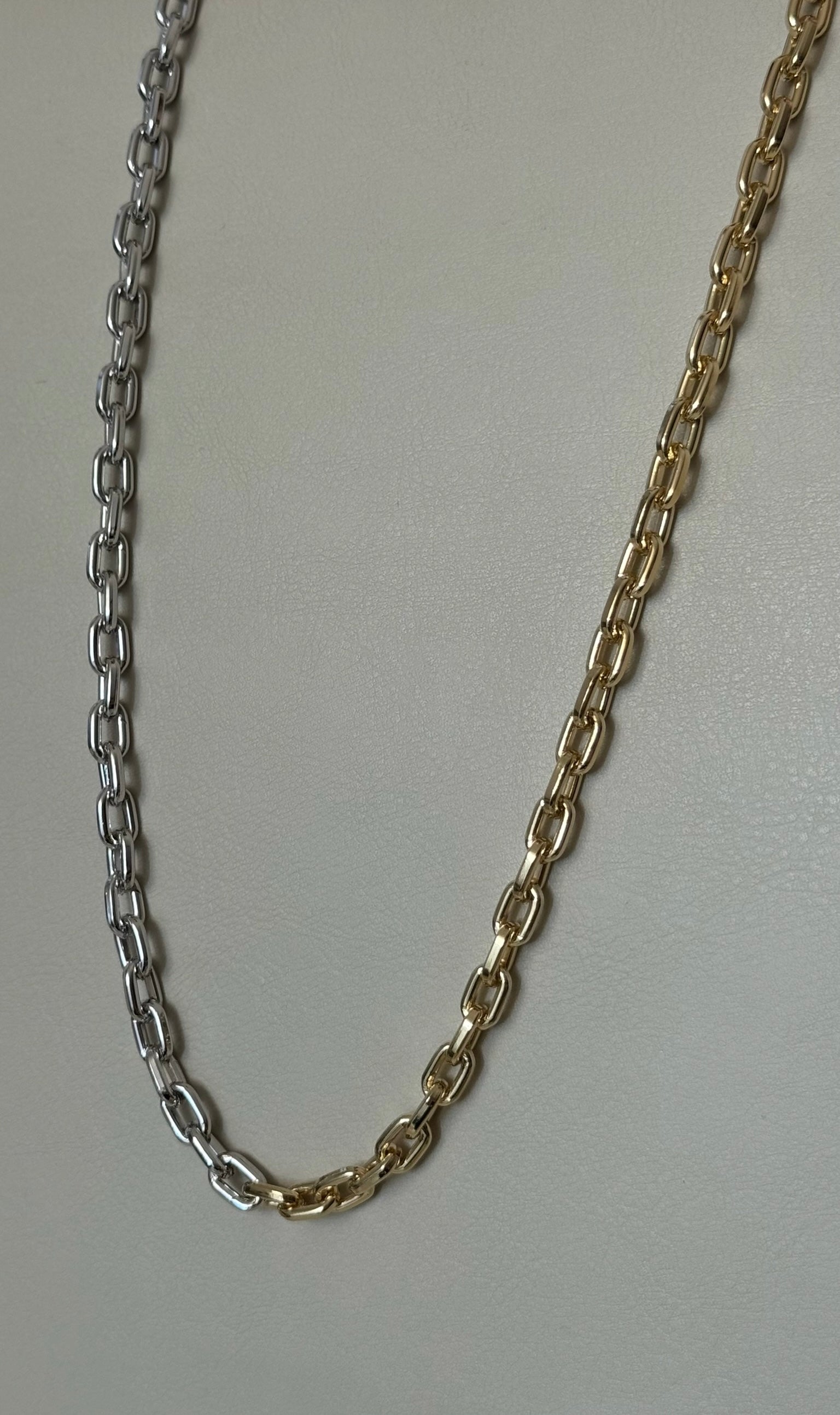 Colar de elos com mix de banhos em ouro e ródio, um design elegante que combina sofisticação e modernidade. Sua presença marcante transforma qualquer produção, do dia a dia a ocasiões especiais, em um look cheio de estilo e personalidade.