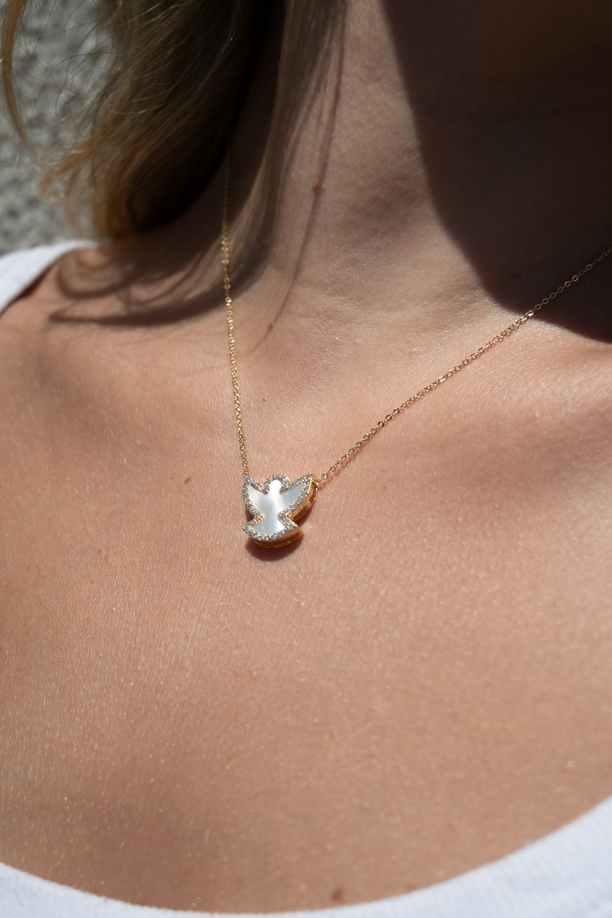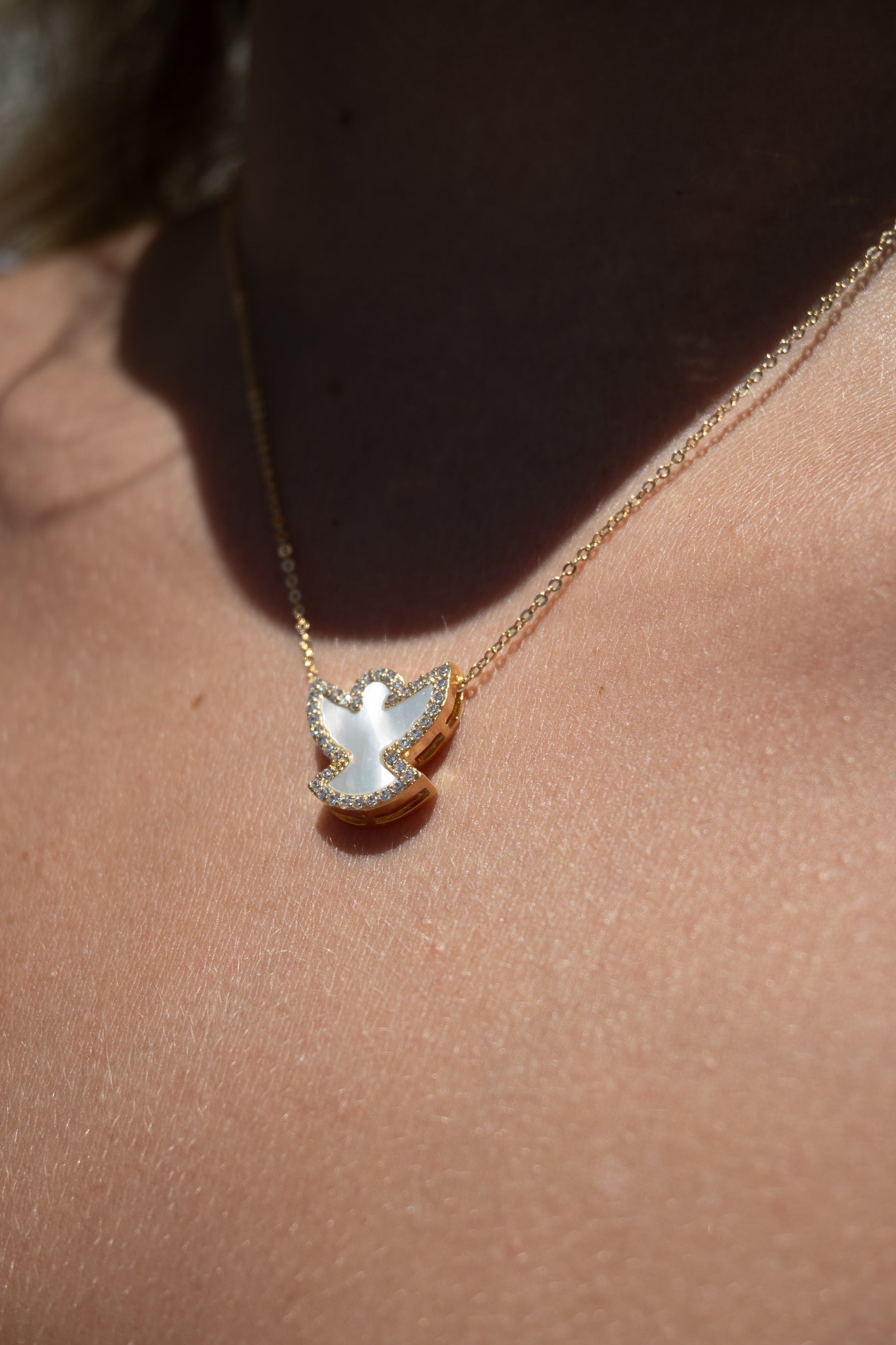 Colar com pingente de Espírito Santo trabalhado em madrepérola, com contorno cravejado em zircônias. Uma verdadeira joia, cheia de significado e luz. Delicado, versátil e extremamente elegante, é um presente perfeito para ocasiões especiais ou para quem ama peças cheias de propósito e beleza.