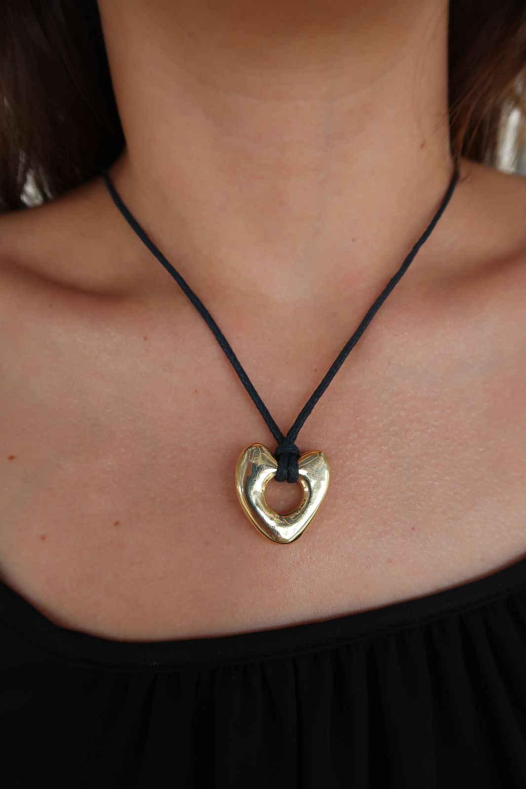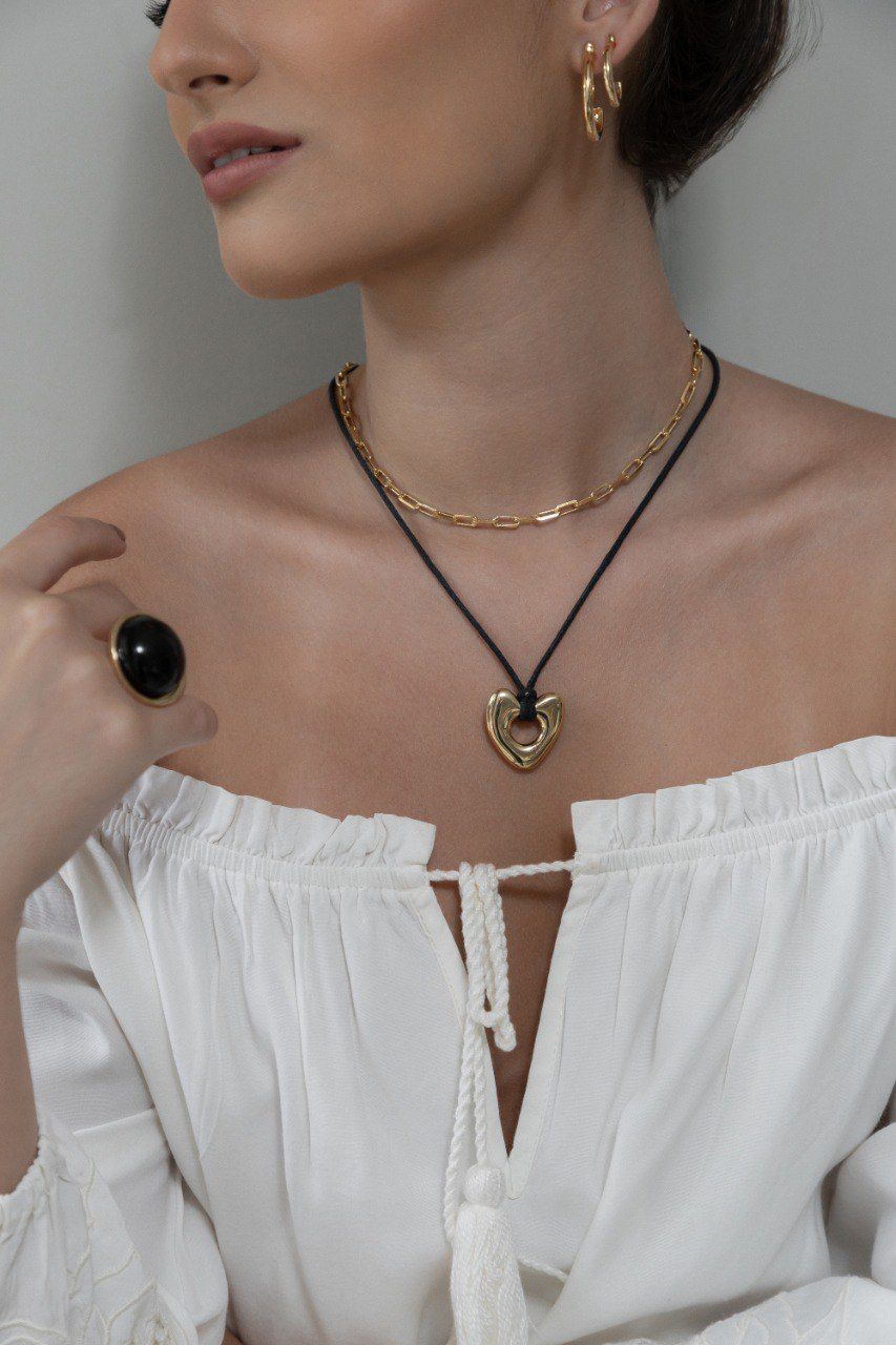 Moderno e cheio de personalidade, este colar combina um sofisticado cordão de tecido preto com um imponente pingente de coração em eletroformação, banhado a ouro 18K. Uma peça versátil e marcante, perfeita para adicionar um toque de estilo e modernidade a qualquer look. Use sozinho para um visual poderoso ou combine com outros acessórios para composições ainda mais autênticas.
