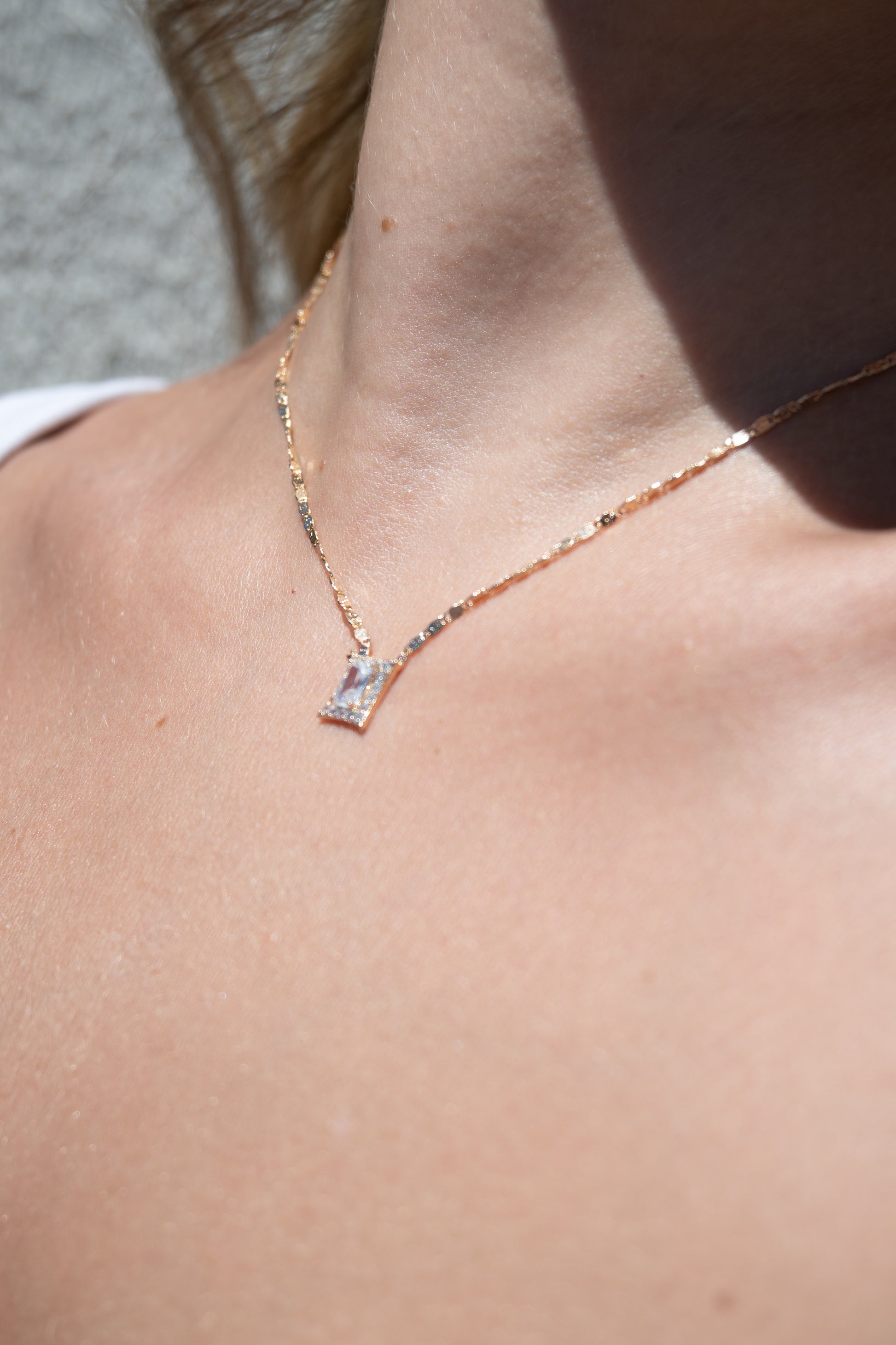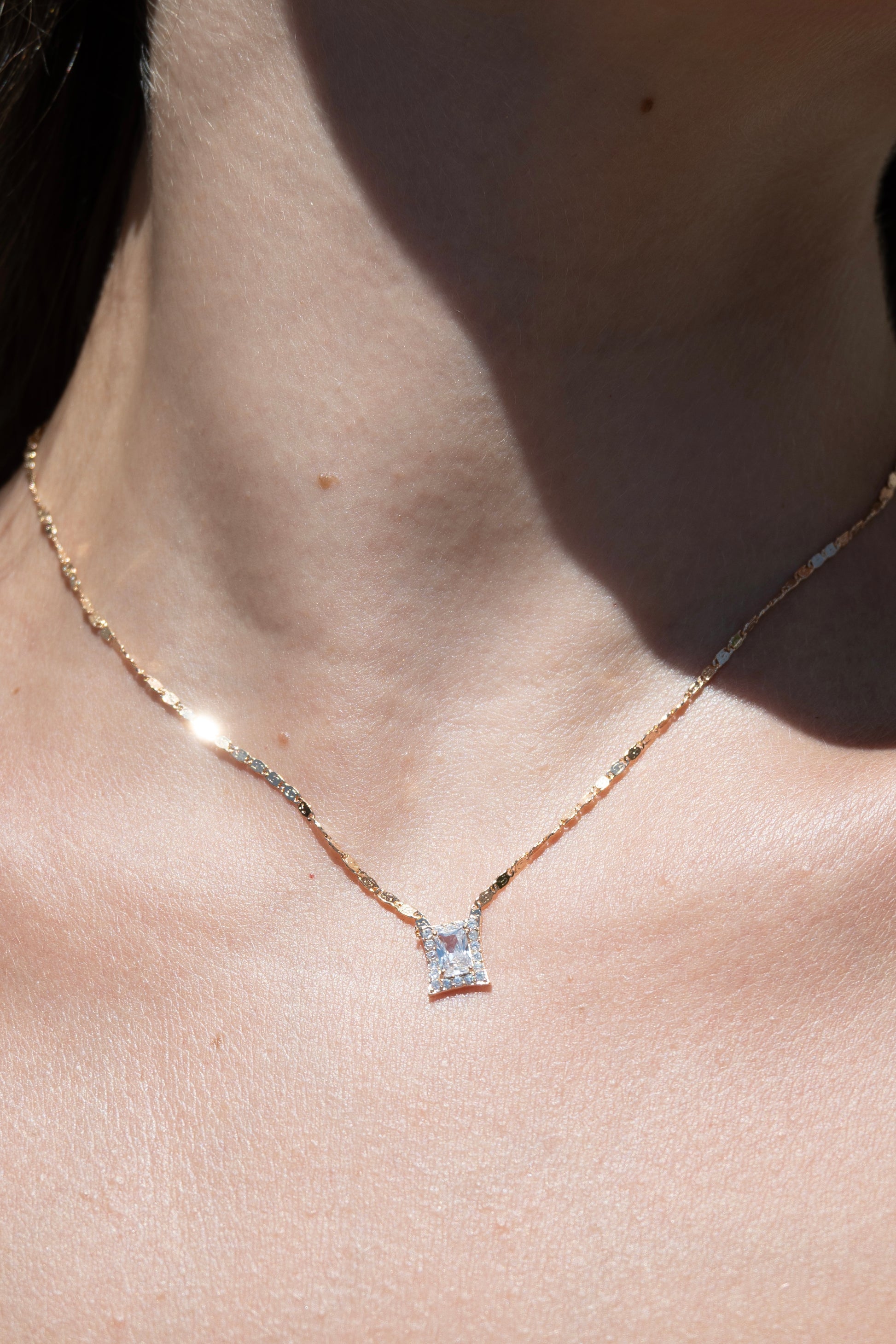 Colar com pingente em zircônia de formato retangular, único e elegante. A peça possui corrente delicada com pequenas medalhas, que trazem brilho e personalidade. Delicado e luminoso, é uma verdadeira joia.
