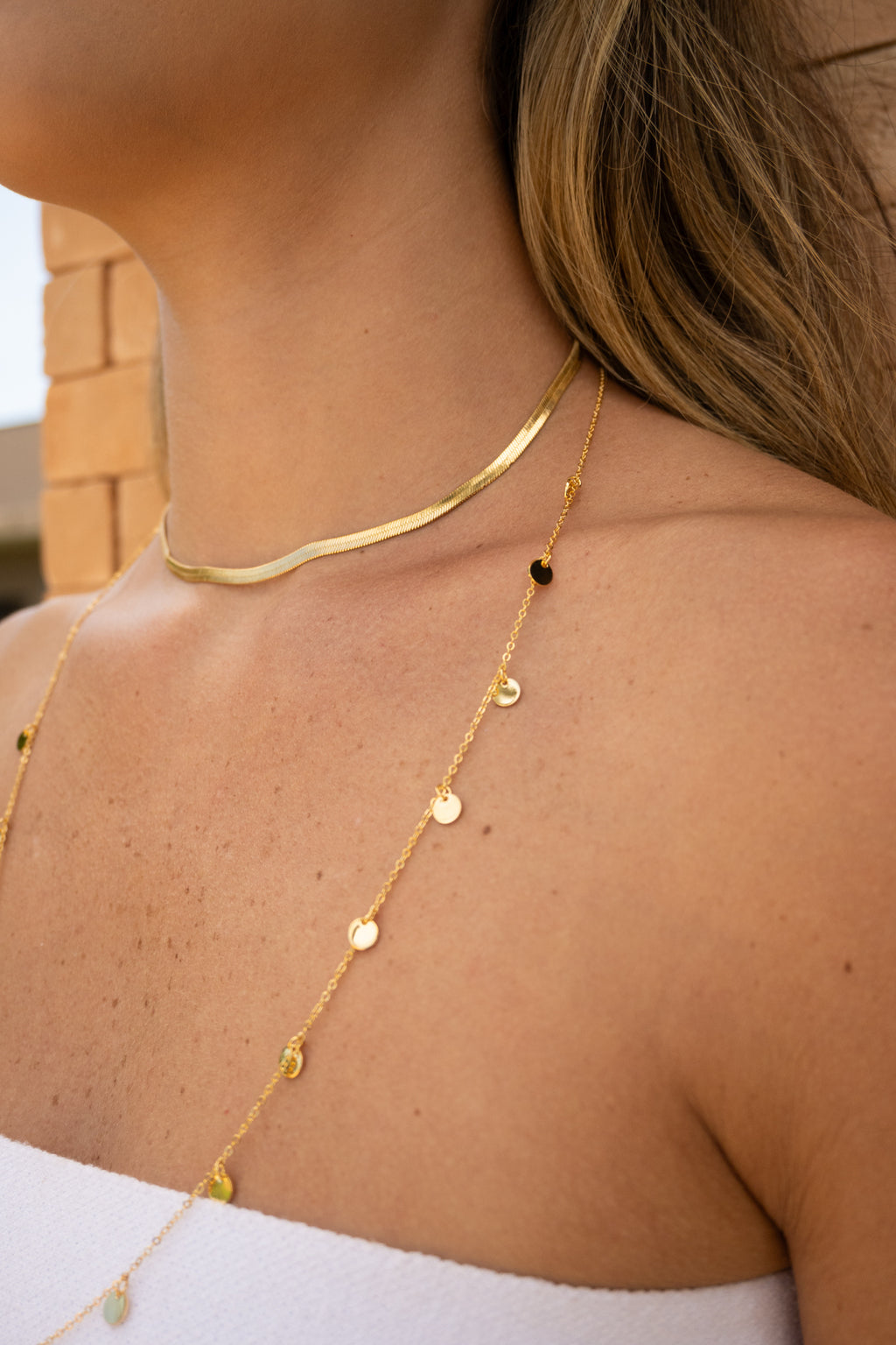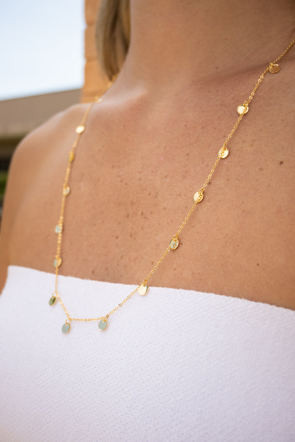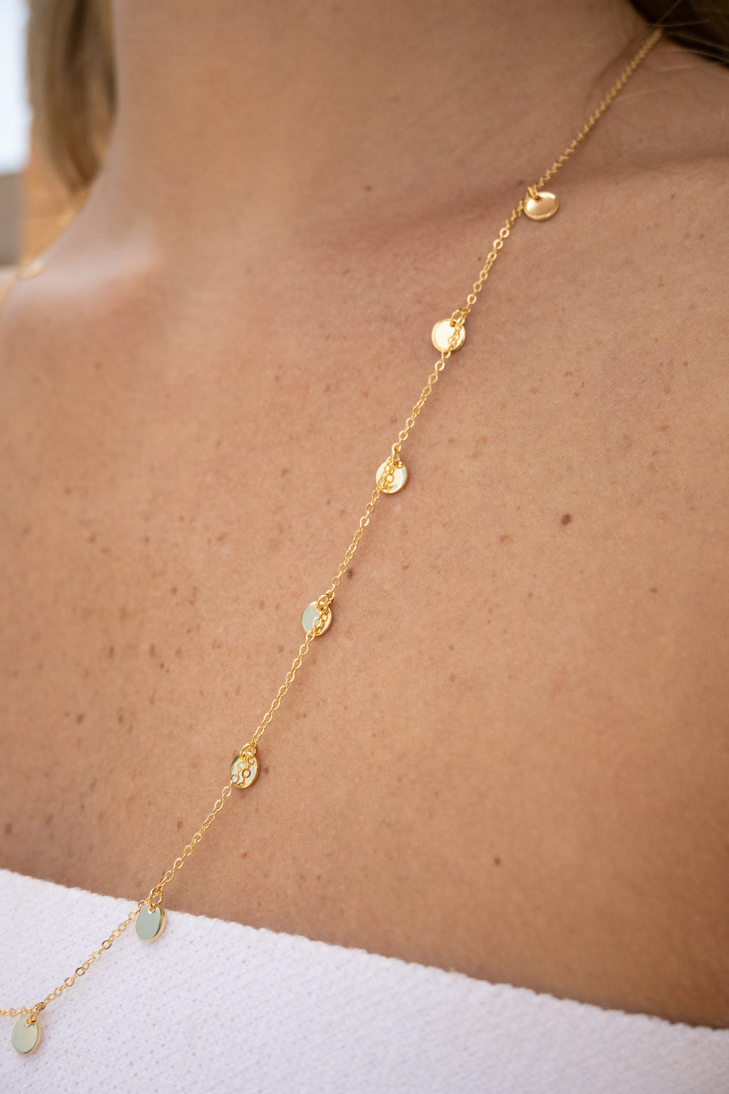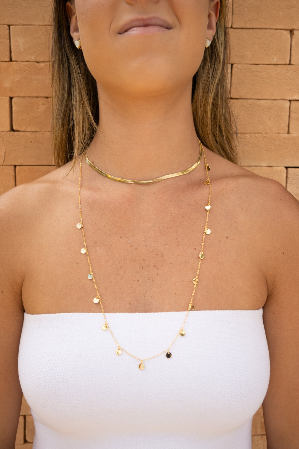 Colar longo com detalhes em medalhas douradas, que trazem um brilho especial à peça. Ideal para adicionar brilho e sofisticação ao look, esta peça é a cara do verão. Perfeita para looks de praia ou para ser usada sobre as roupas, trazendo um toque de elegância descontraída e charme.