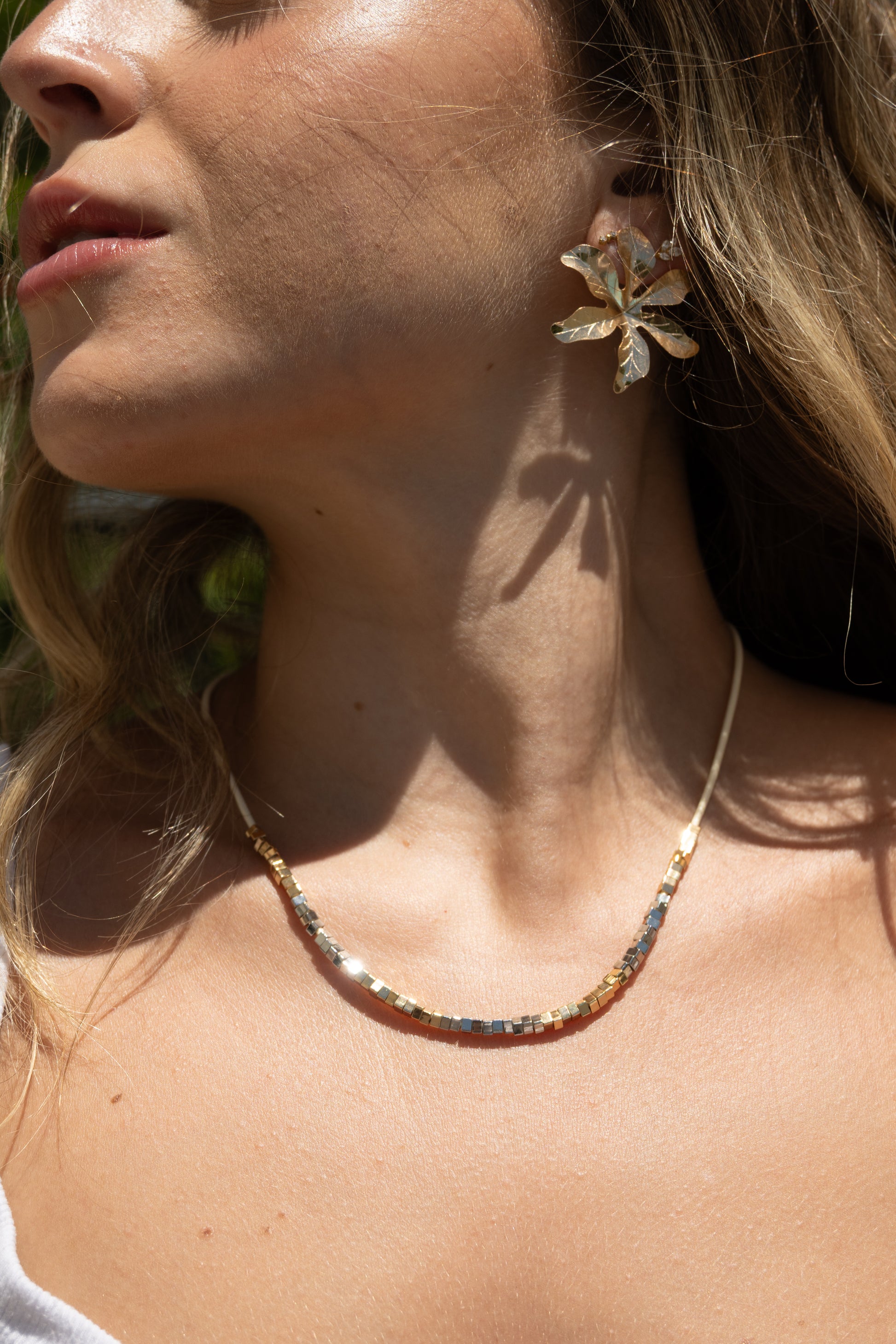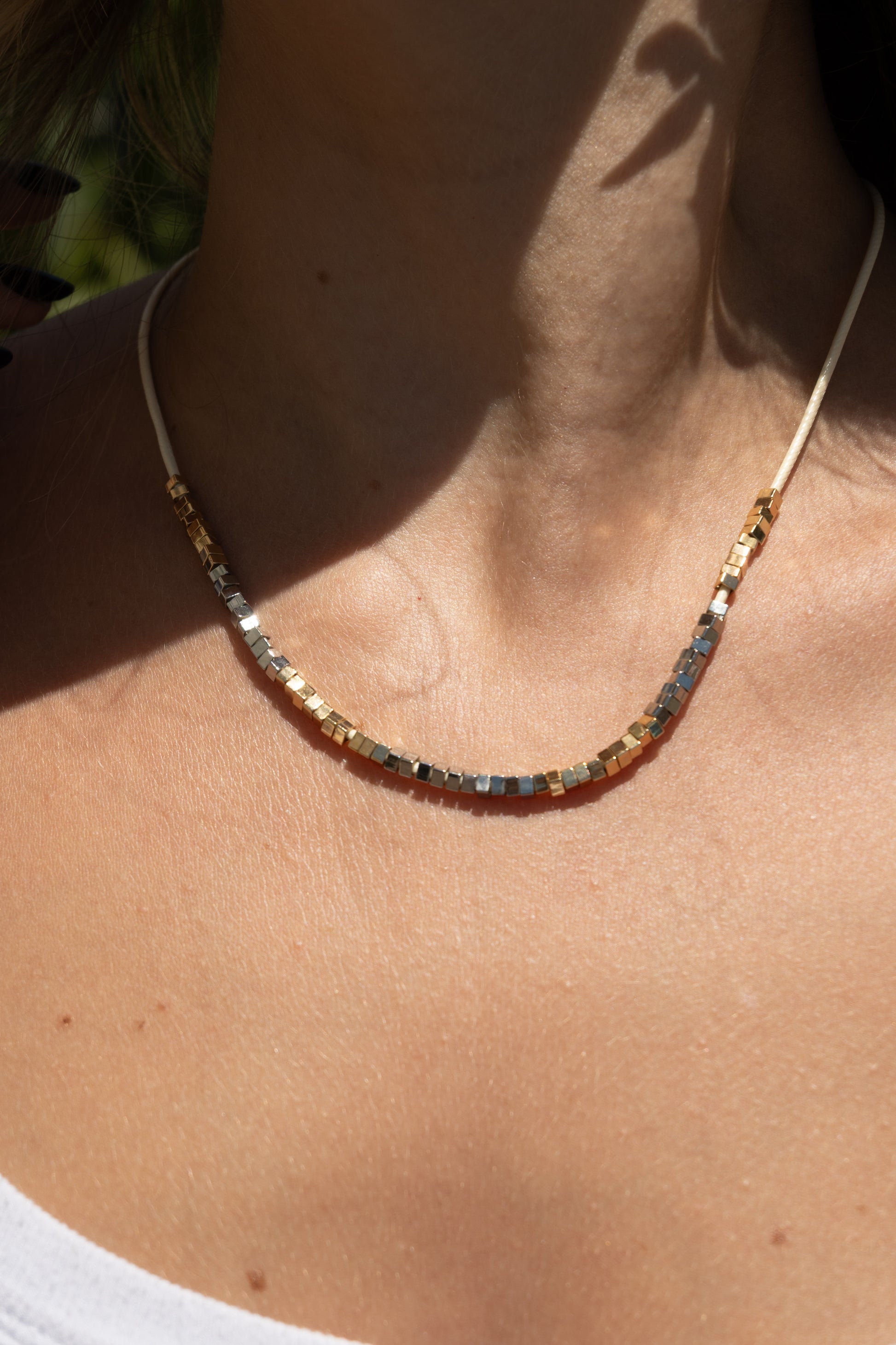 Colar feito em courino branco, composto por canutilhos no banho de ouro e no banho de ródio, criando um mix de banhos moderno e sofisticado. Os canutilhos refletem a luz com um brilho surreal, trazendo destaque imediato ao look. Uma peça versátil e única, perfeita tanto para produções noturnas quanto para elevar um visual diurno com elegância e estilo.