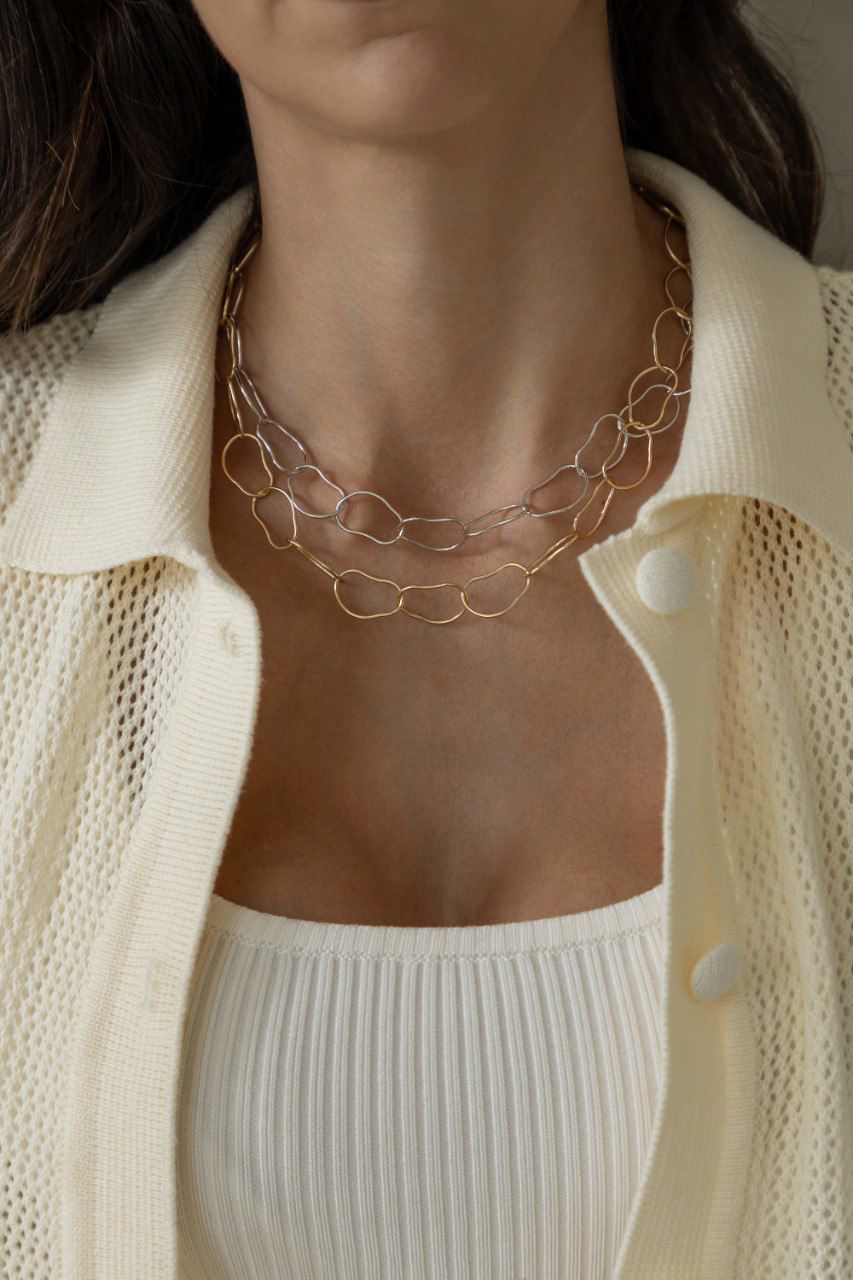 Seus elos em formas orgânicas trazem movimento e elegância, criando um visual moderno e cheio de personalidade. Pode ser usado sozinho como destaque ou combinado com outros colares em composições sofisticadas.