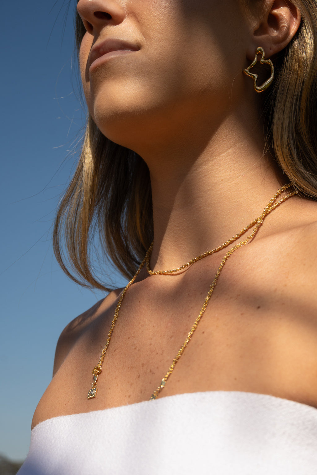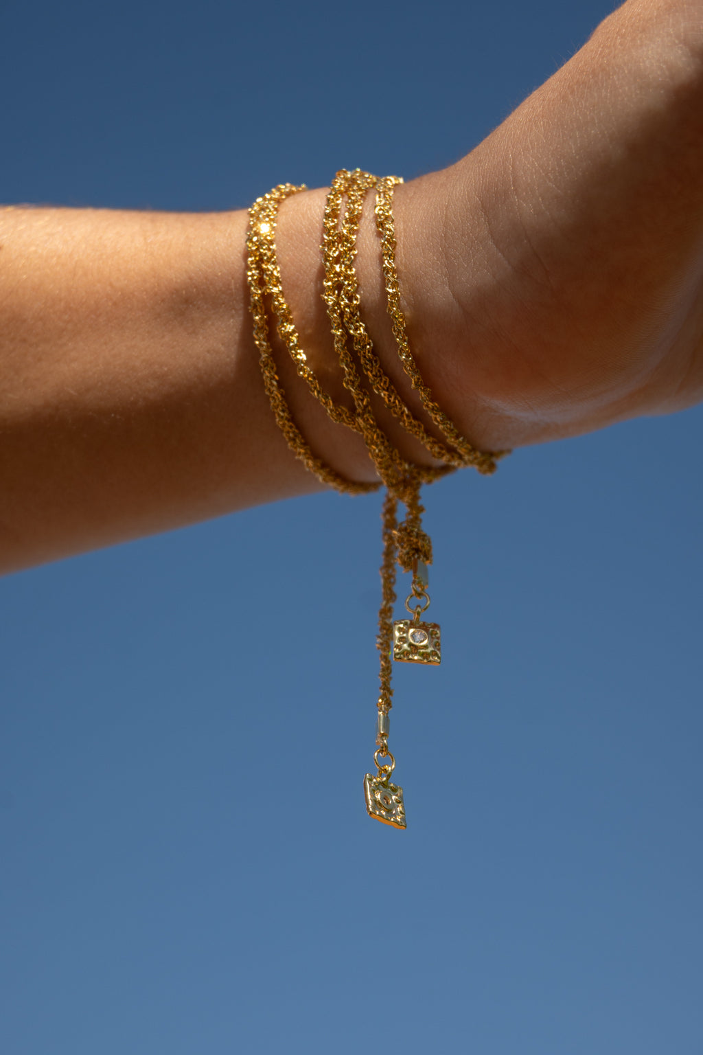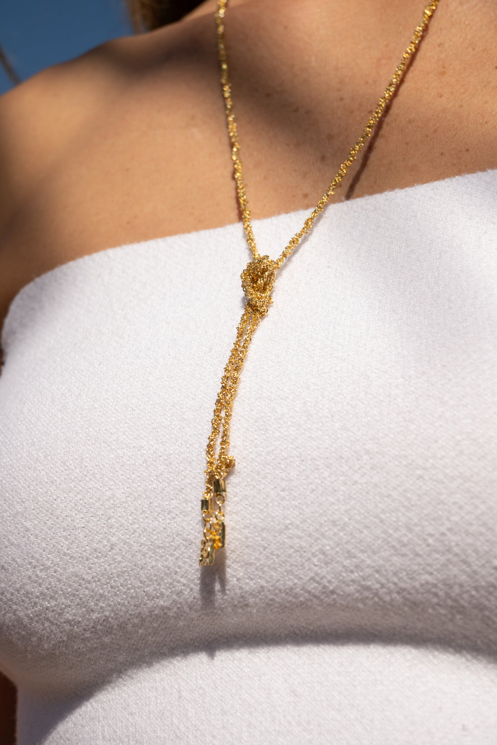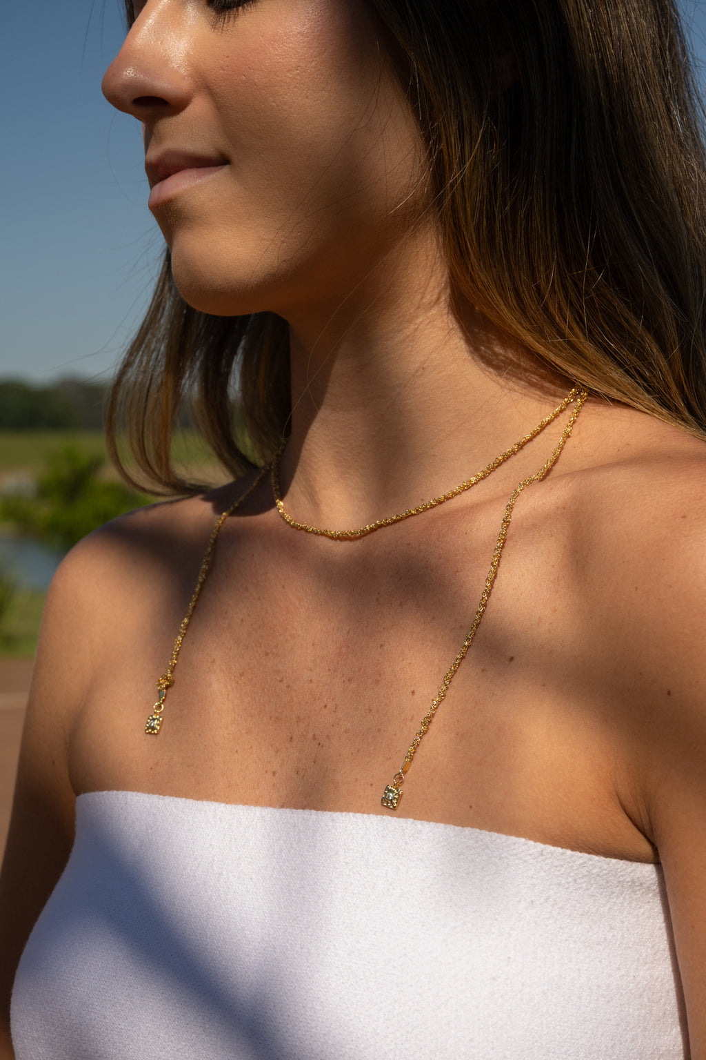 Colar longo sem fecho, feito com tramas entrelaçadas que garantem um brilho único e exclusivo à peça. Graças ao seu design trançado, é possível dar um nó no colar sem que ele embole, o que o torna extremamente versátil. Pode ser usado de várias formas, criando diferentes alturas e camadas para looks variados. Além de colar, transforma-se facilmente em pulseira e até mesmo em cinto, oferecendo infinitas possibilidades para quem busca um acessório descolado e com a cara do verão.