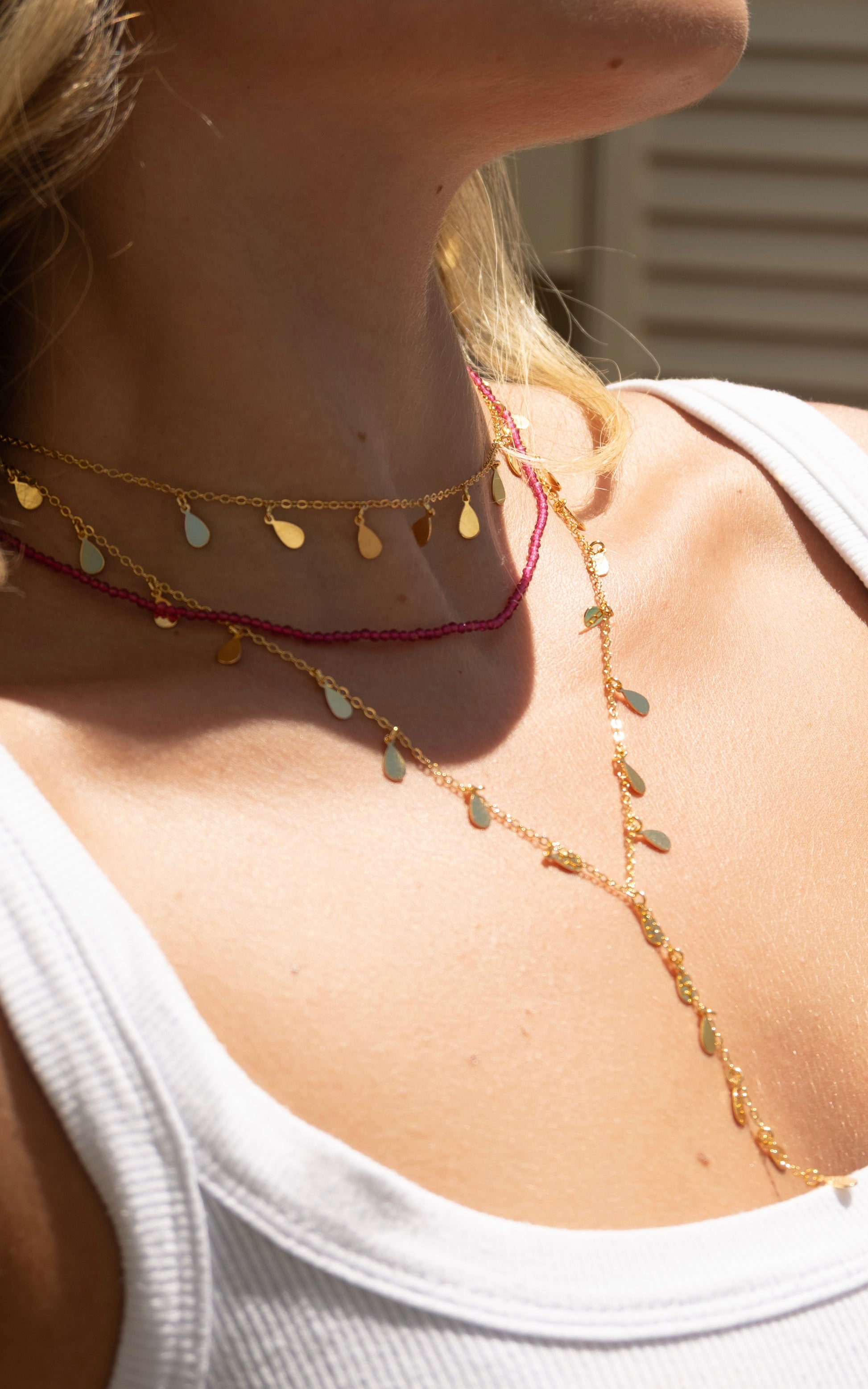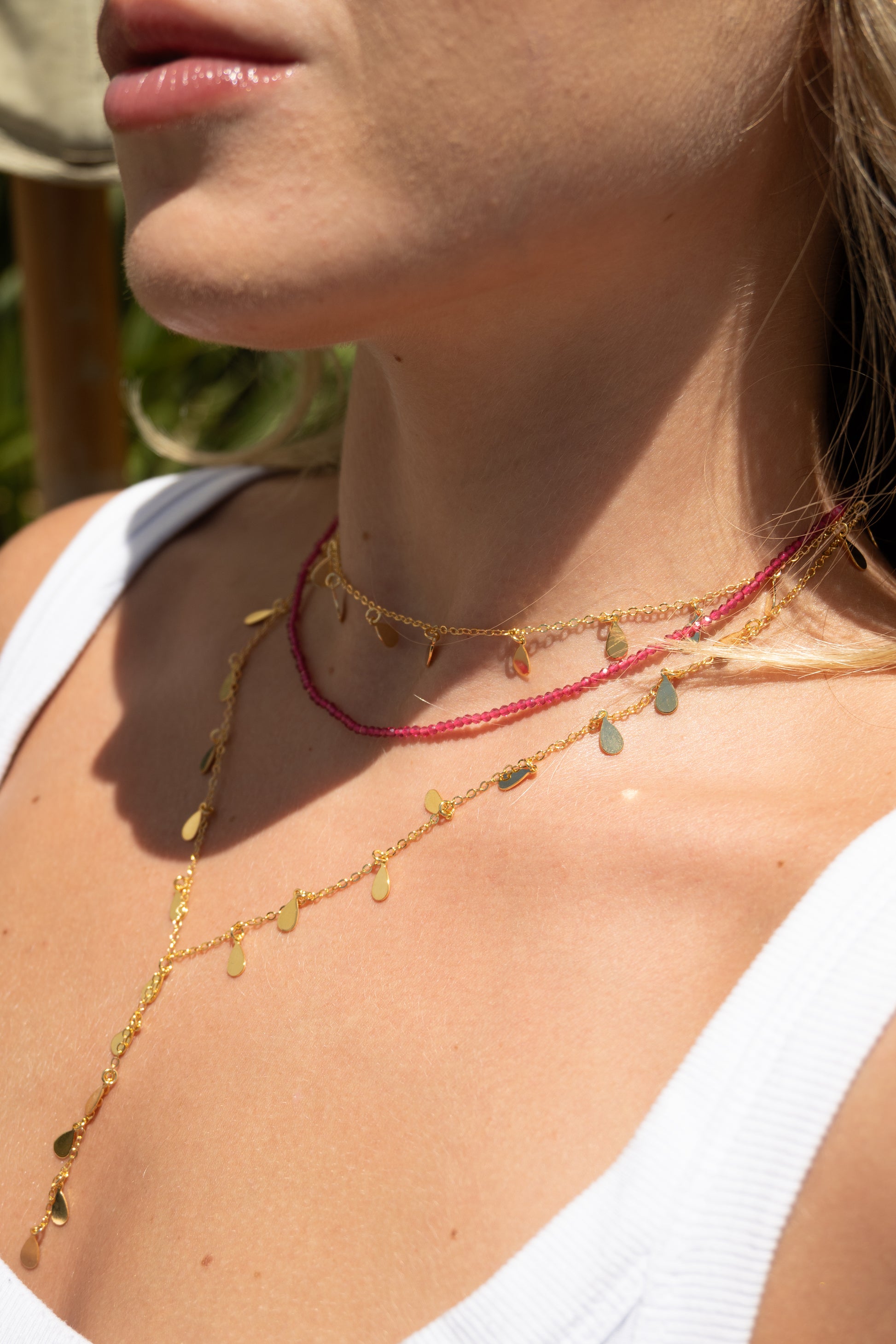 Compre junto: Colar gravatinha gotas + choker gotas + Colar cristais pink