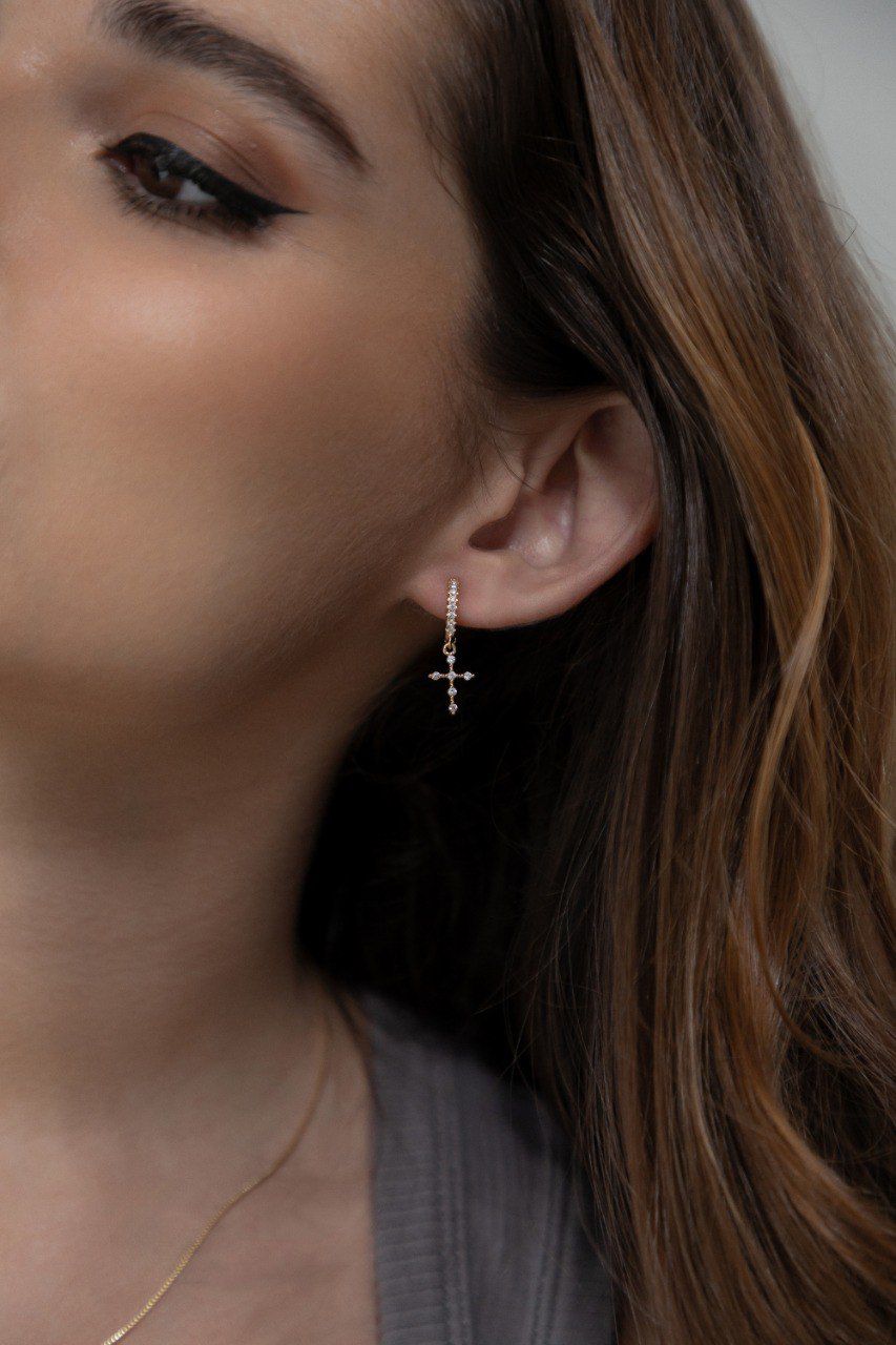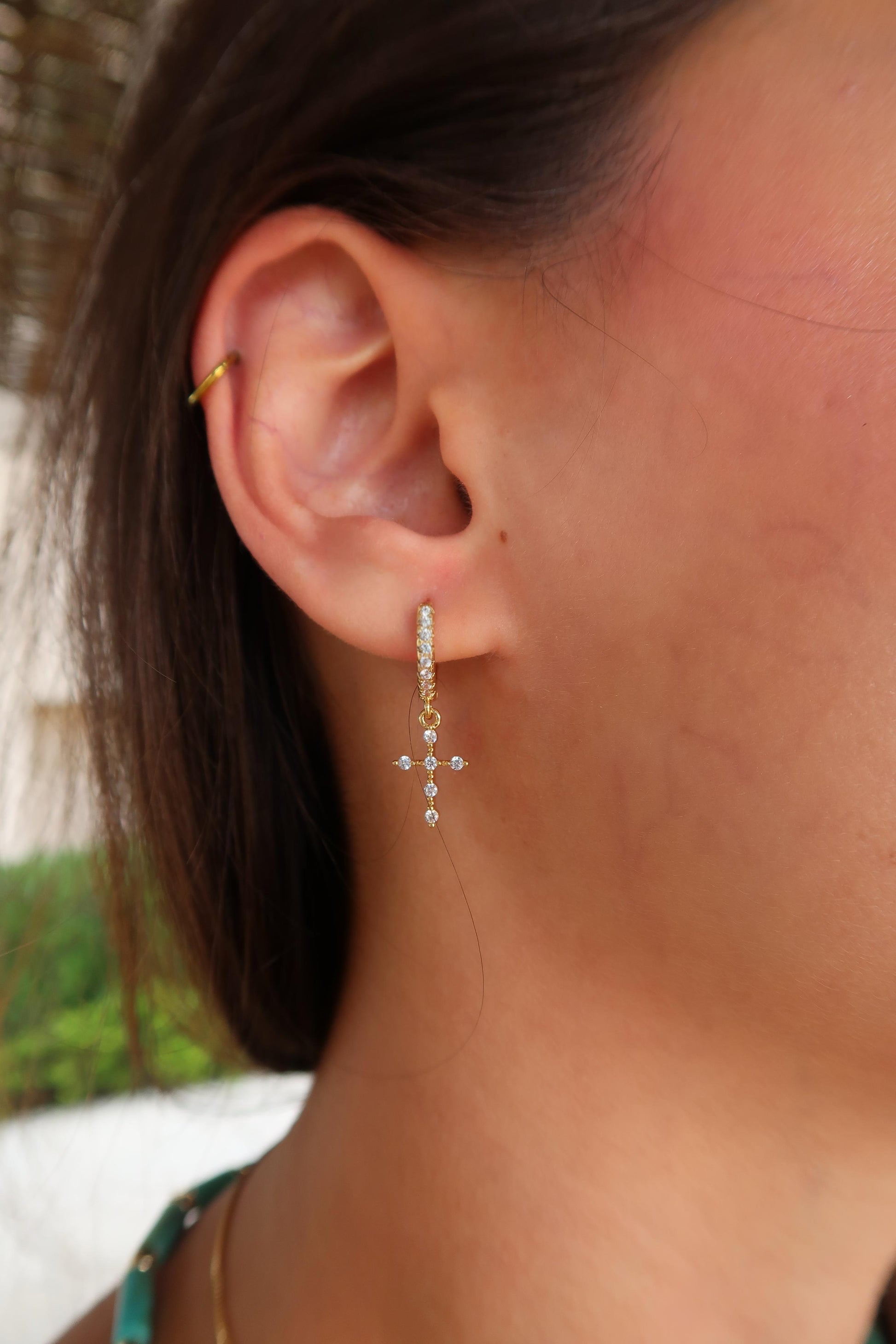 Delicada e sofisticada, esta mini argola é inteiramente cravejada em zircônias, garantindo um brilho único e elegante. O pingente de cruz adiciona um toque moderno e refinado à peça. Atemporal e versátil, pode ser usada sozinha para um look minimalista ou combinada com outros brincos para criar um mix poderoso e estiloso. Perfeita para quem ama acessórios clássicos com um toque de glamour!