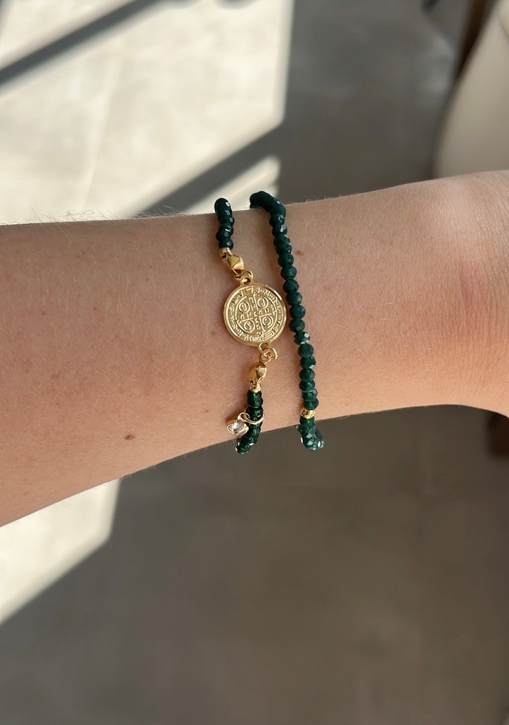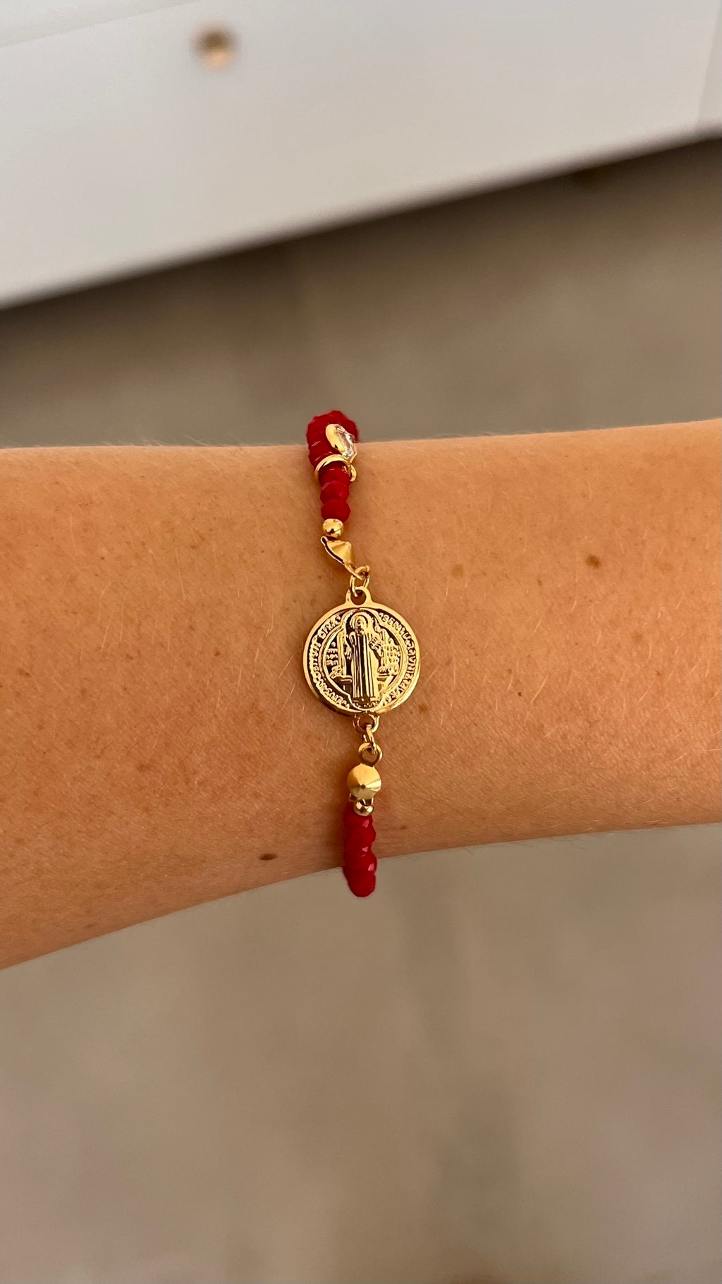 Elegante e cheia de significado, essa pulseira combina cristais naturais com um brilho único e a proteção da medalha de São Bento, banhada a ouro 18K. O fio de nylon ajustável garante conforto e resistência, adaptando-se perfeitamente ao pulso sem risco de arrebentar. Disponível em vermelho, verde e nude, une estilo e espiritualidade em um acessório sofisticado e versátil.