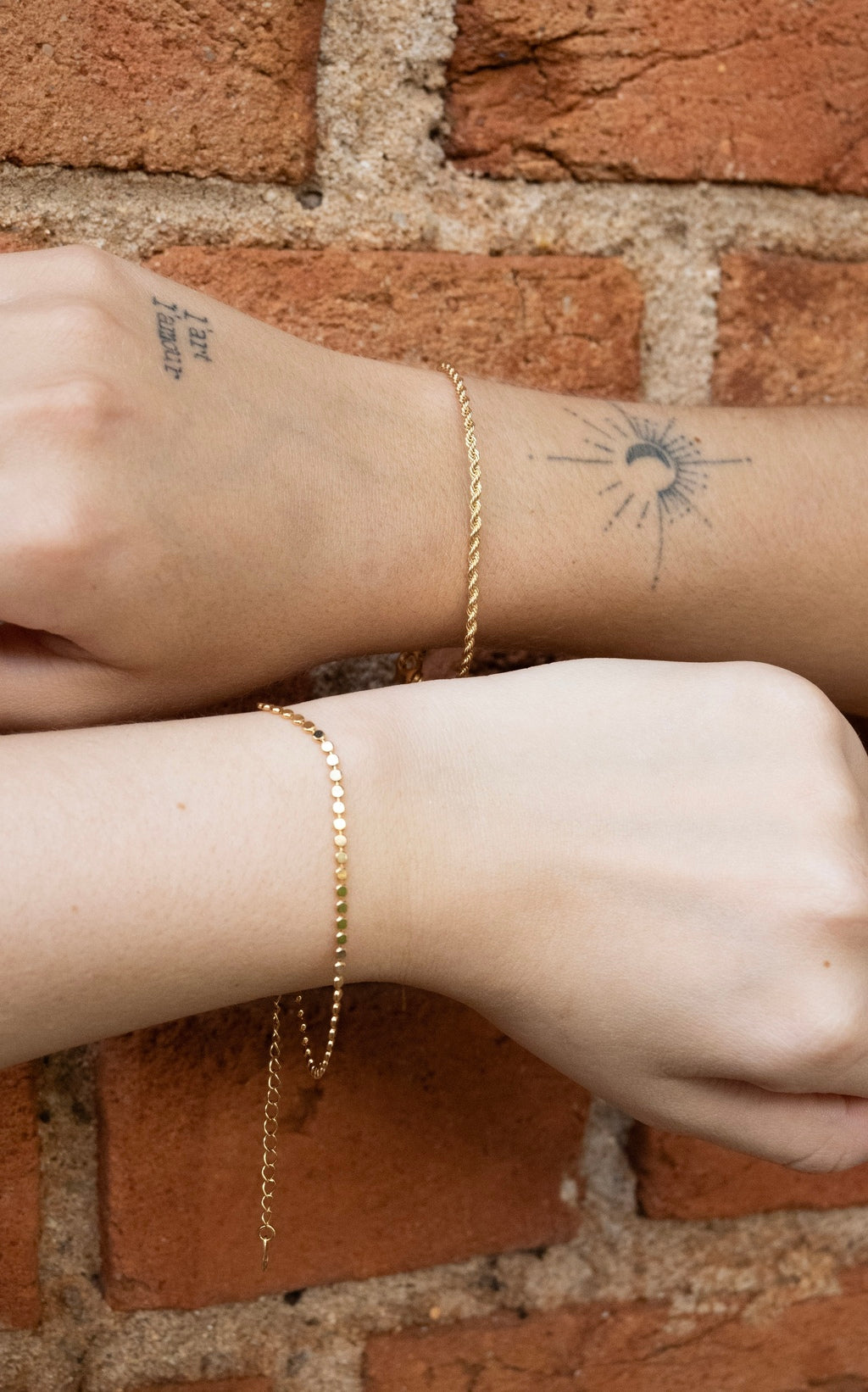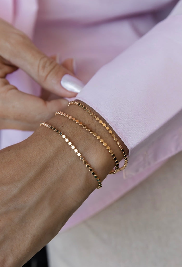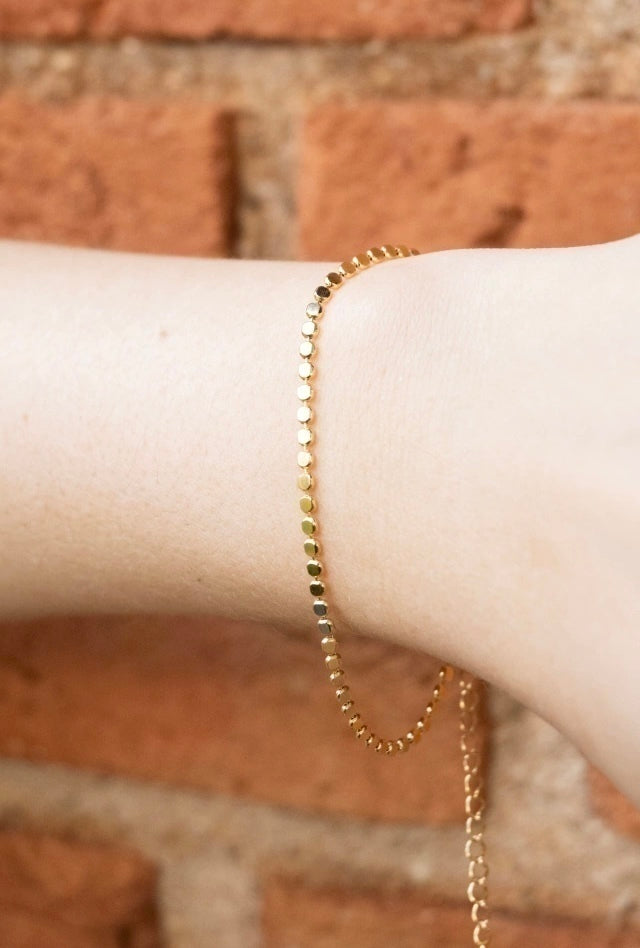 Pulseira com detalhes de pequenas medalhas e é banhada a ouro 18k, proporcionando um brilho luxuoso e duradouro. Seu design versátil a torna perfeita para criar mix de peças e complementar diversos looks.